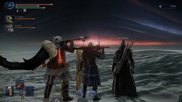 假如你們都是黑魂/法環老ASS,那基本也無需任何語音和打字交流,僅憑標點就能實現完全的溝通。如果一起打各個不同的BOSS來一路平推下去的話,不僅能Get到這遊戲的樂趣所在、而且還很爽。