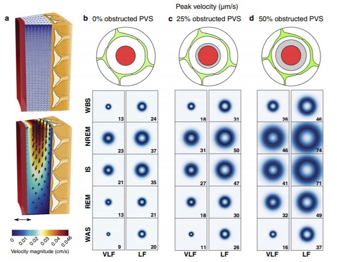 此前研究表明,神经递质去甲肾上腺素(与肾上腺素化学性质接近)在小鼠大脑中的水平每隔约50秒节律性波动,从而促使血管收缩。Nedergaard团队发现,在小鼠非快速眼动(non-REM)睡眠阶段,这种波动与脑血流量变化同步,延迟时间不到半秒。而在清醒或快速眼动(REM)睡眠阶段,这种关联性不明显。