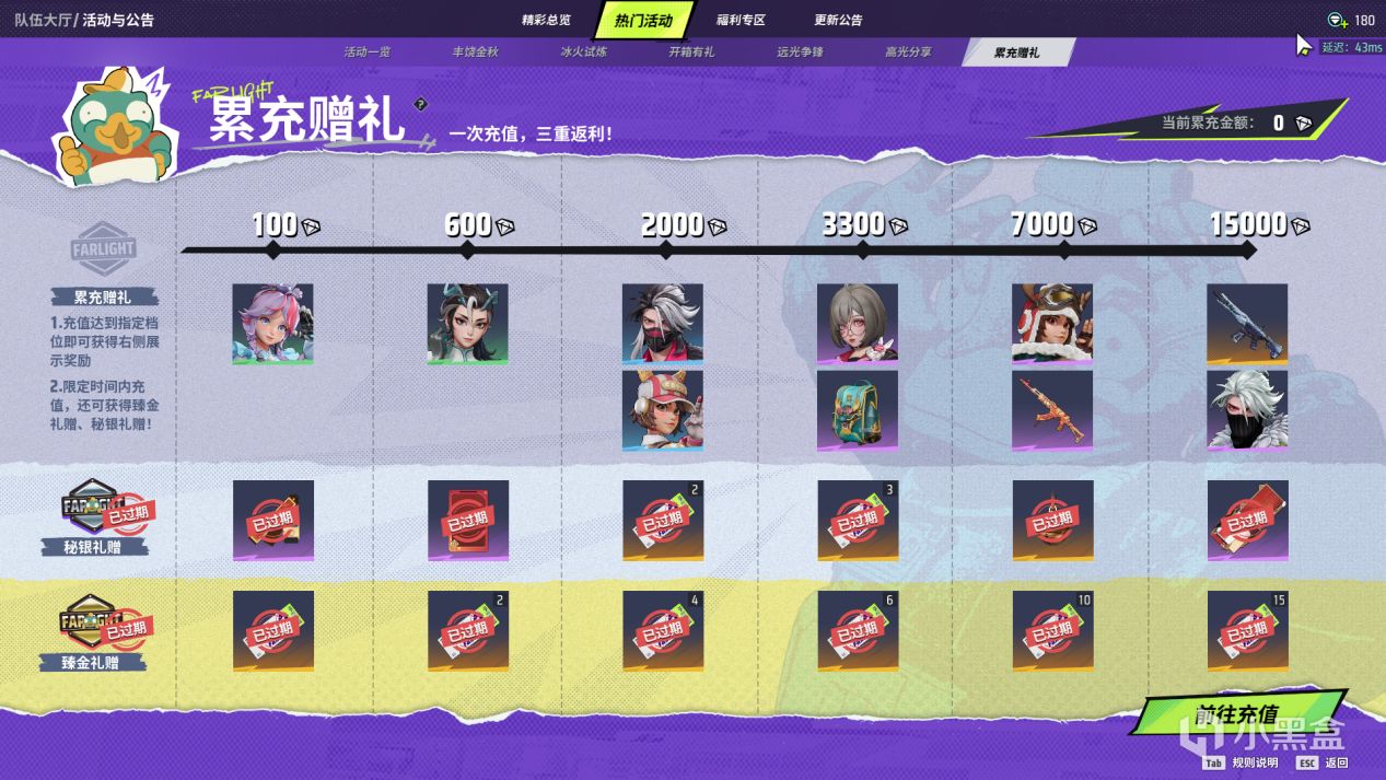 2、累充活動界面是另一個我非常想吐槽的例子。本來是一個限時期間內充值可以領取額外獎勵的活動,按照常規思維,完全可以單獨做一個頁面,時間到期了這個頁面消失,這樣那些沒看到或者沒趕上活動的玩家也不會太膈應。但《遠光84》的項目組就這麼赫然的把它和遊戲裏的常駐累充獎勵放一起了,彷彿生怕玩家不知道他們已經錯過了最佳的充值時間,這直接導致了我往後都沒有了充值的想法。