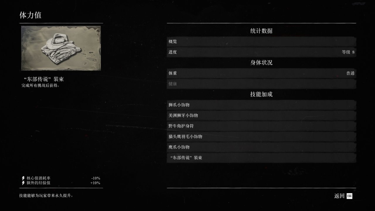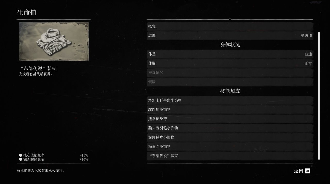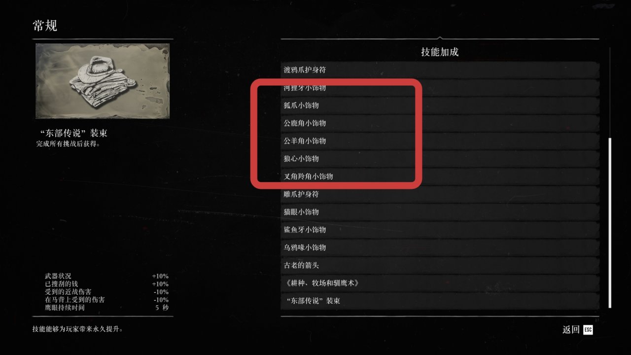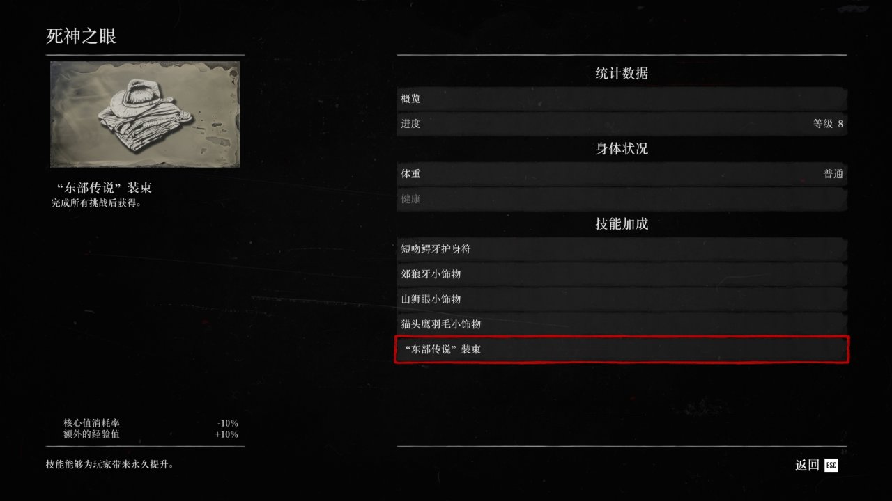 東部傳說裝束: 做完所有挑戰後獲得,也可以卡機制第二章獲得。機制:做任意8項挑戰,在第8項最後一個完成時,立刻按暫停,等待3s返回即可。不能用賭徒10,草藥10,推薦捕獵10。