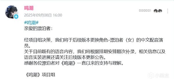 1. 今日(9月8日),国产游戏《鸣潮》发出通告,将更换本作主角漂泊者(女)的配音演员。本次公告并未说明更换配音演员的原因,但根据网传消息近期该配音演员陷入了不当言行争议。来源:3DM