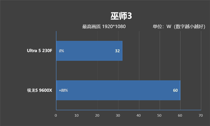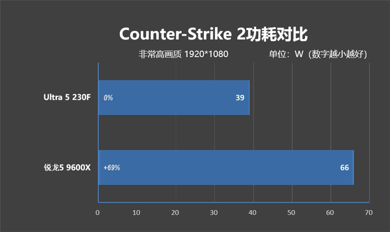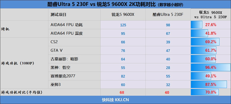 綜合6款遊戲的數據,銳龍5 9600X的平均遊戲功耗爲68W,而酷睿Ultra 5 230F竟然只有40W,前者的遊戲功耗足足高了70%。