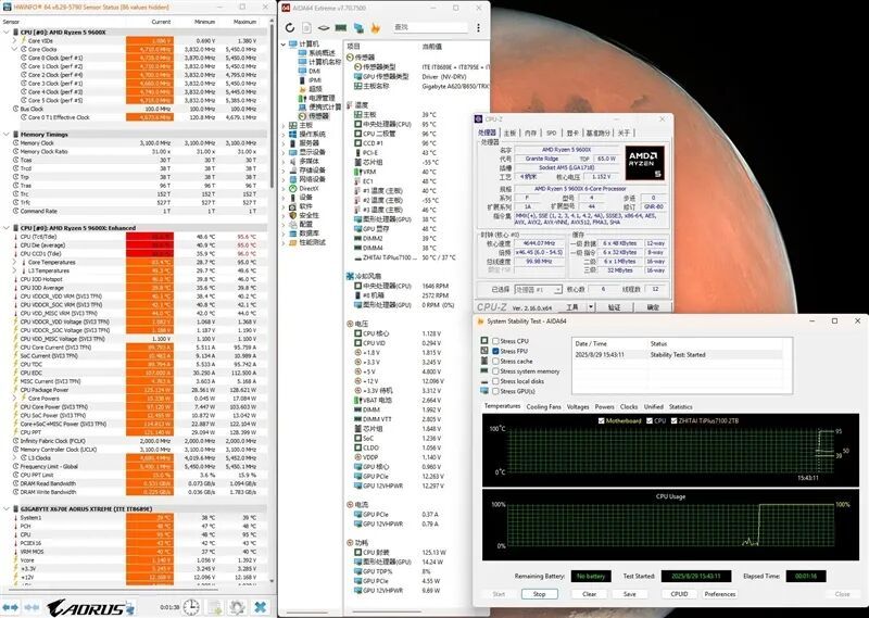 銳龍5 9600X僅僅烤機1分鐘就撞上了95度溫度牆,此時功耗125W,全核頻率4.7GHz。