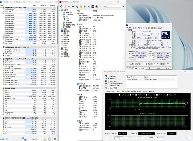 另外需要注意的是,酷睿Ultra 5 230F的最高全核頻率是4.8GHz,烤機時已經達到了這個頻率,因此98W就是它的最高功耗。