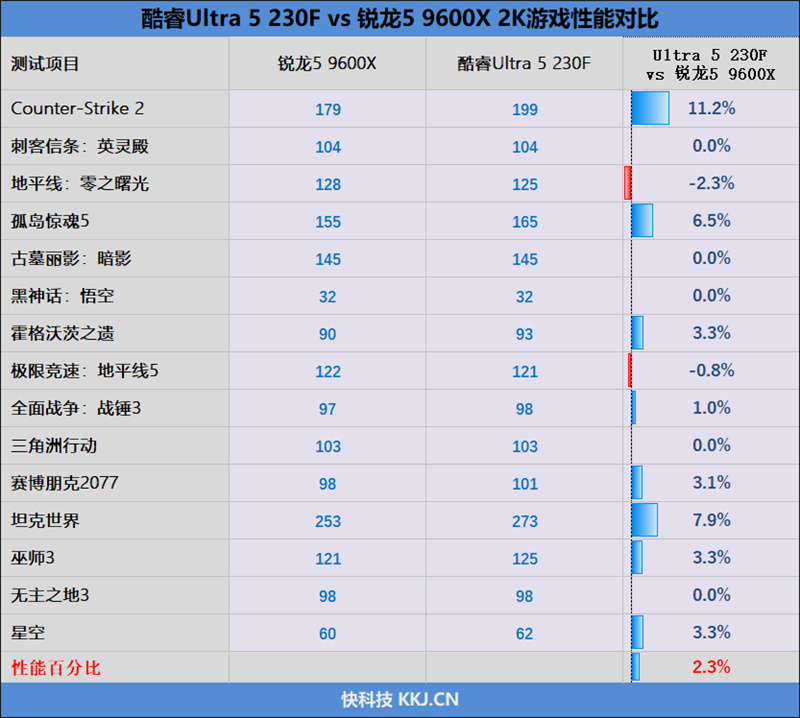 綜合15款遊戲的測試成績,在1080P分辨率下,了酷睿Ultra 5 230F的平均幀率要比銳龍5 9600X高了3.7%,2K分辨率下領先幅度依然有2.4%