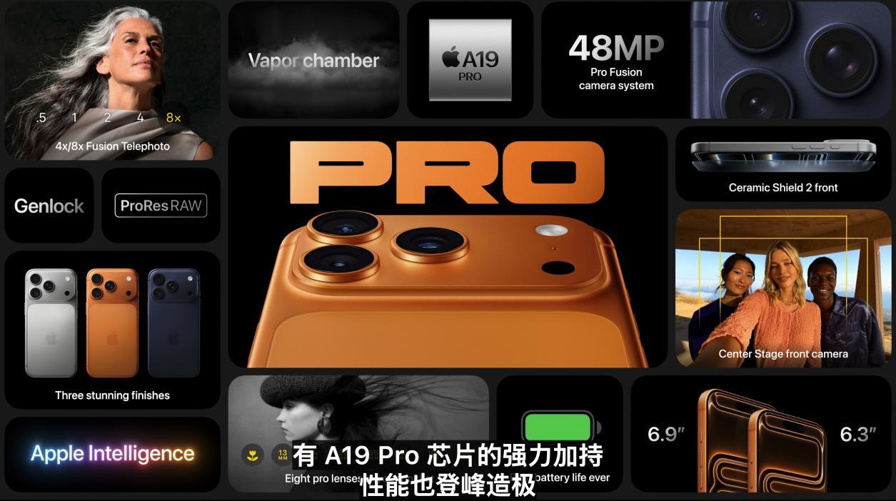 性能方面,iPhone 17 Pro系列搭載A19 Pro芯片(6核CPU和6核GPU),並內置VC均熱板散熱系統,搭配金屬一體化機身,散熱散熱效率大幅提升。