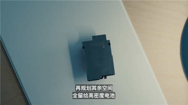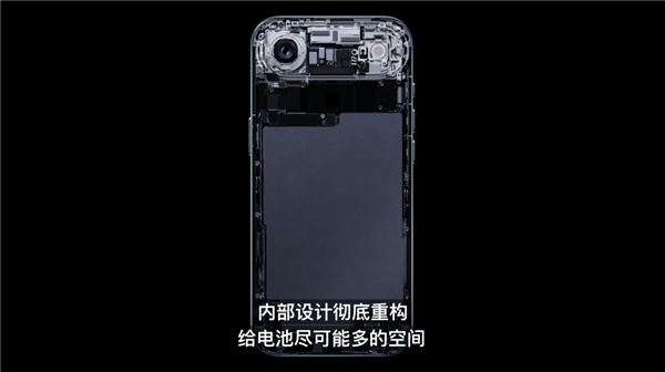 背部一条贯穿整机的“平台”区域是这款机器的核心部分,也是几乎所有零件空间,这一条集成后摄、前摄、扬声器与苹果的A19 Pro芯片。