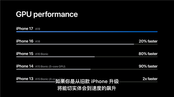 在最关键的芯片部分,iPhone 17核心为基于第三代3nm工艺的A19芯片:官方说,6核CPU比iPhone 13的A15快1.5倍,5核GPU提速逾2倍,每颗GPU核心内置神经加速器,可在本地运行生成式AI模型。