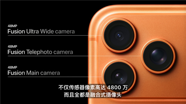 苹果也终于三颗镜头硬件都升级了一下,更大的后置相机区域,页能容纳三颗4800万像素镜头,还让天线系统环绕其布局,所以苹果说它信号更好。