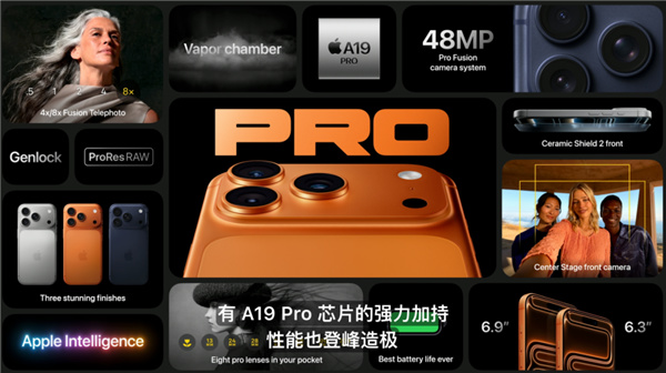 核心配置是A19 Pro芯片(6 核CPU + 6 核GPU),持续性能比iPhone 16 Pro系列提升40%;