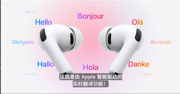 借助手机上的Apple Intelligence苹果智能,耳机可以实现实时翻译功能,演示片效果很棒,颇有种科幻片感觉,可在英语、法语、德语、葡萄牙语与西班牙语之间即时互译,年内还将扩展更多语言。