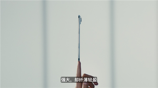 iPhone Air出场的画面,完全展示了机身仅5.6mm,史上最薄iPhone的样子;而边框采用抛光钛金属(我们猜这么薄的机身铝合金hold不住)。
