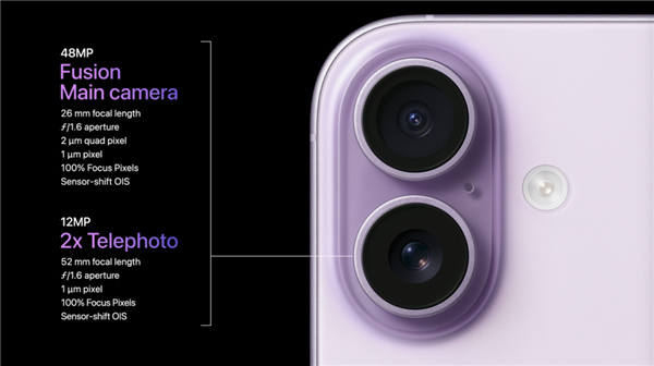 后置影像系统全面升级到4800万像素:主摄集成光学2倍长焦,苹果称“一摄两用”;全新 4800万超广角分辨率提升4倍,广角与微距表现均更出色。新一代图像引擎泽可实时识别肤色并针对性调整色彩、高光与阴影;随iOS 26还将新增“亮颜”风格,为肤色提亮并增强整体鲜活度。视频支持4K60fps,具备电影级模式和运动模式,并录制空间音频。