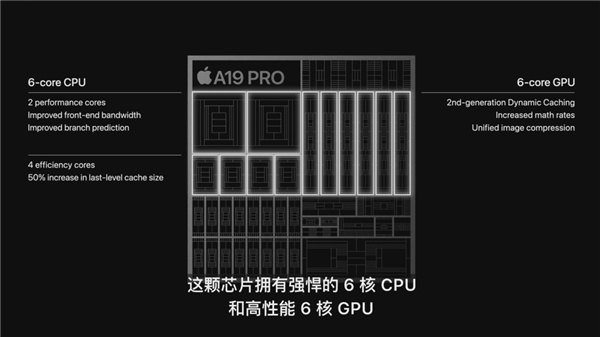 从基础参数上看,A19 Pro 和 A19 一样,都是 6 核 CPU 以及 5 核 GPU 。