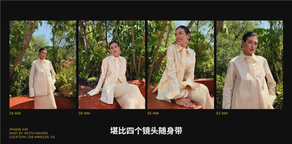 结果发布会上,果果又拿出了去年的抽象宣传法,说带上我们这个 iPhone Air 拍照,就相当于随身携带了 4 颗镜头啊!
