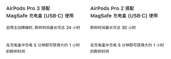 续航方面,AirPods Pro 3 在启用主动降噪的情况下最长可以用 8 小时,如果同时用了心率检测的功能,续航会稍短一些到 6.5 小时,其实咋样都够了,毕竟入耳式耳机戴久了也不健康。