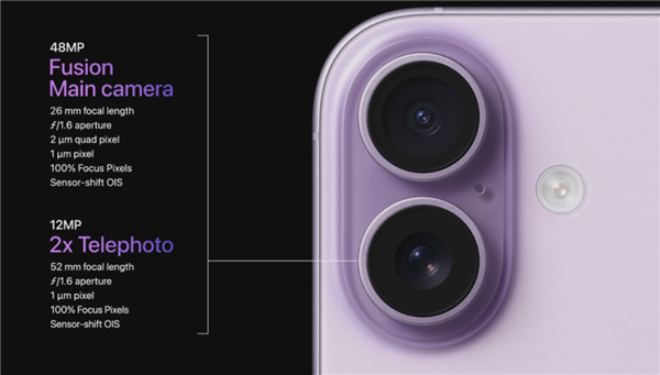 至于相机嘛,iPhone 17 有提升,但不多,依旧是超广角和主摄搭配,也都采用了 4800 万像素融合式摄像头。