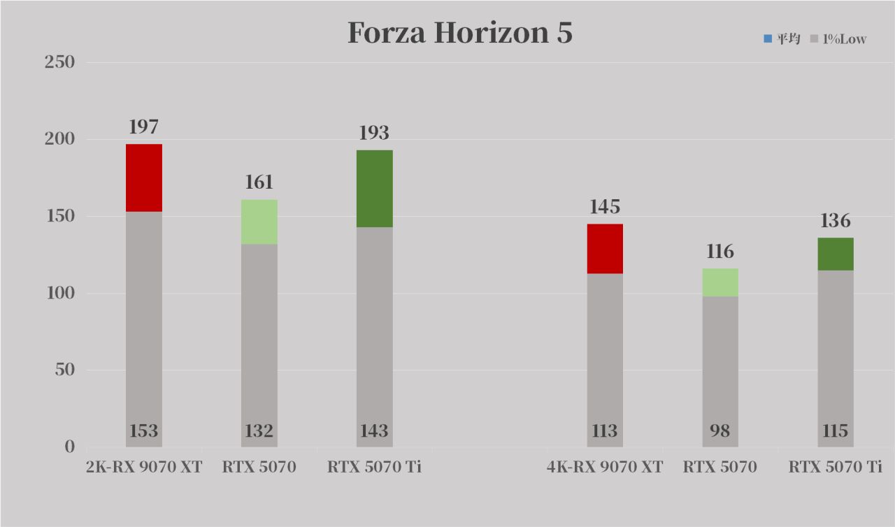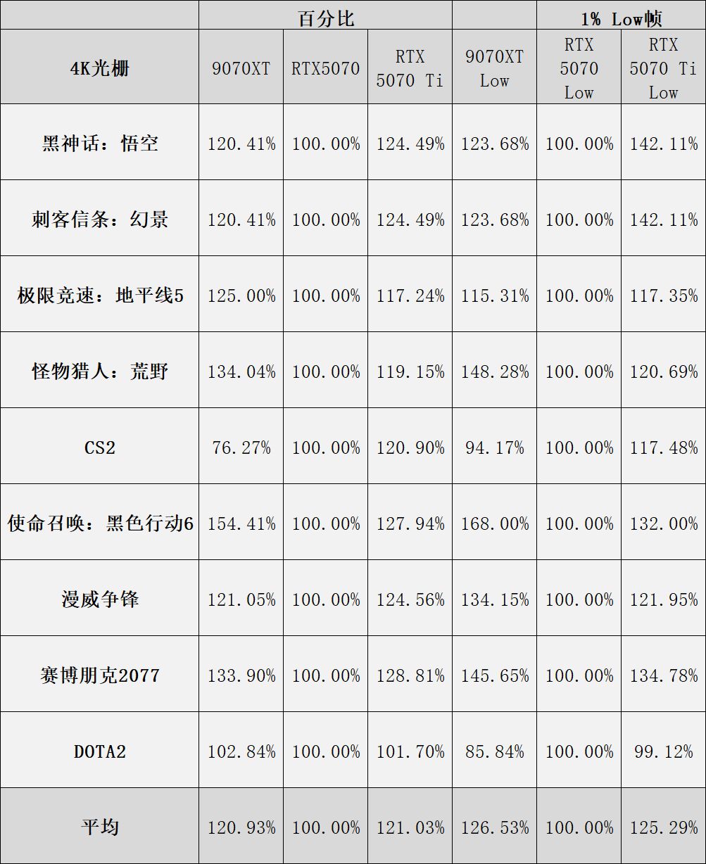 4K光栅成绩结果则更加接近,9070XT和5070Ti分别在部分游戏中占据绝对优势,堪称此消彼长。平均帧均领先20%左右,Low帧则进一步提升至领先25%左右。
