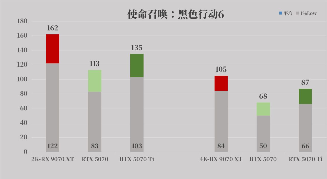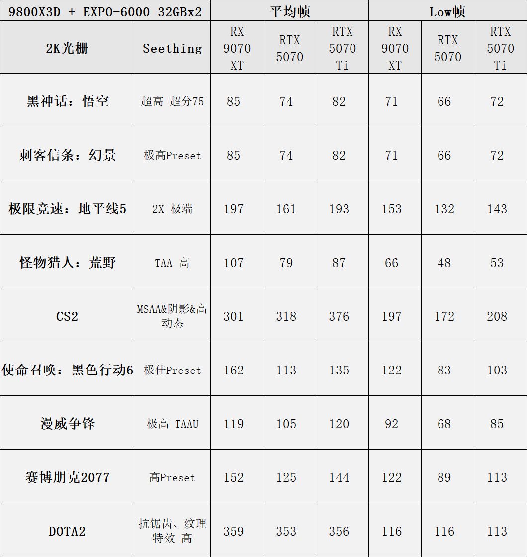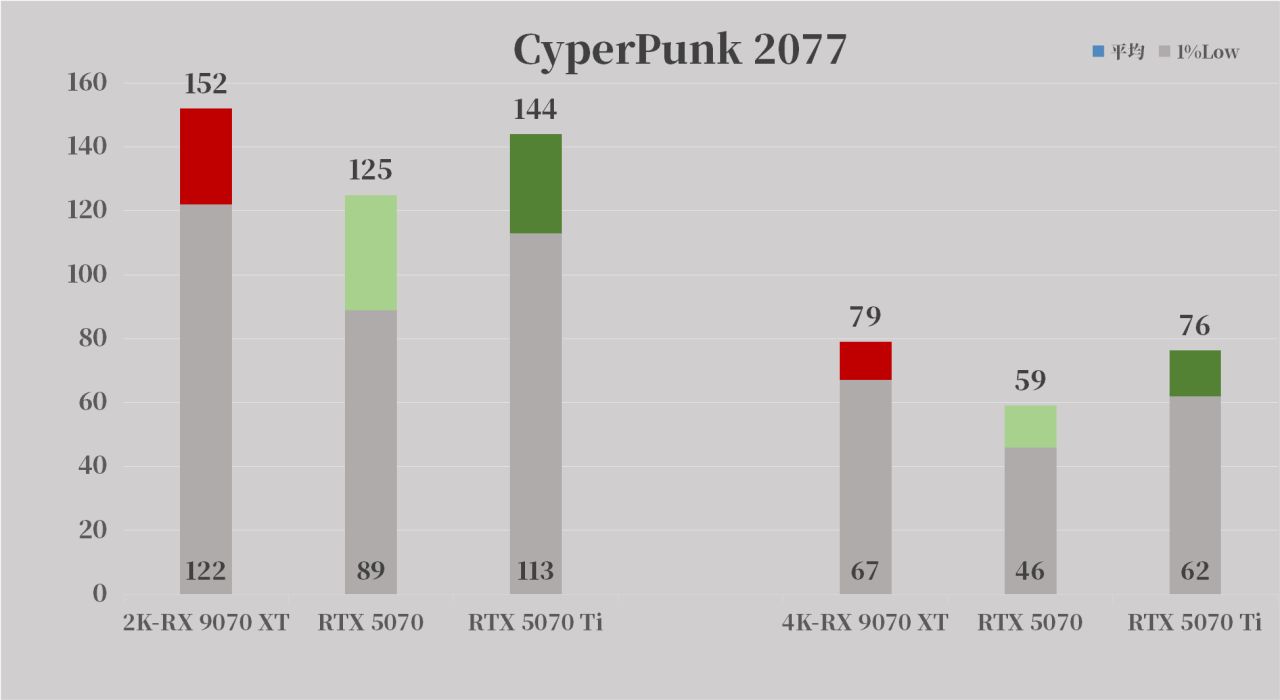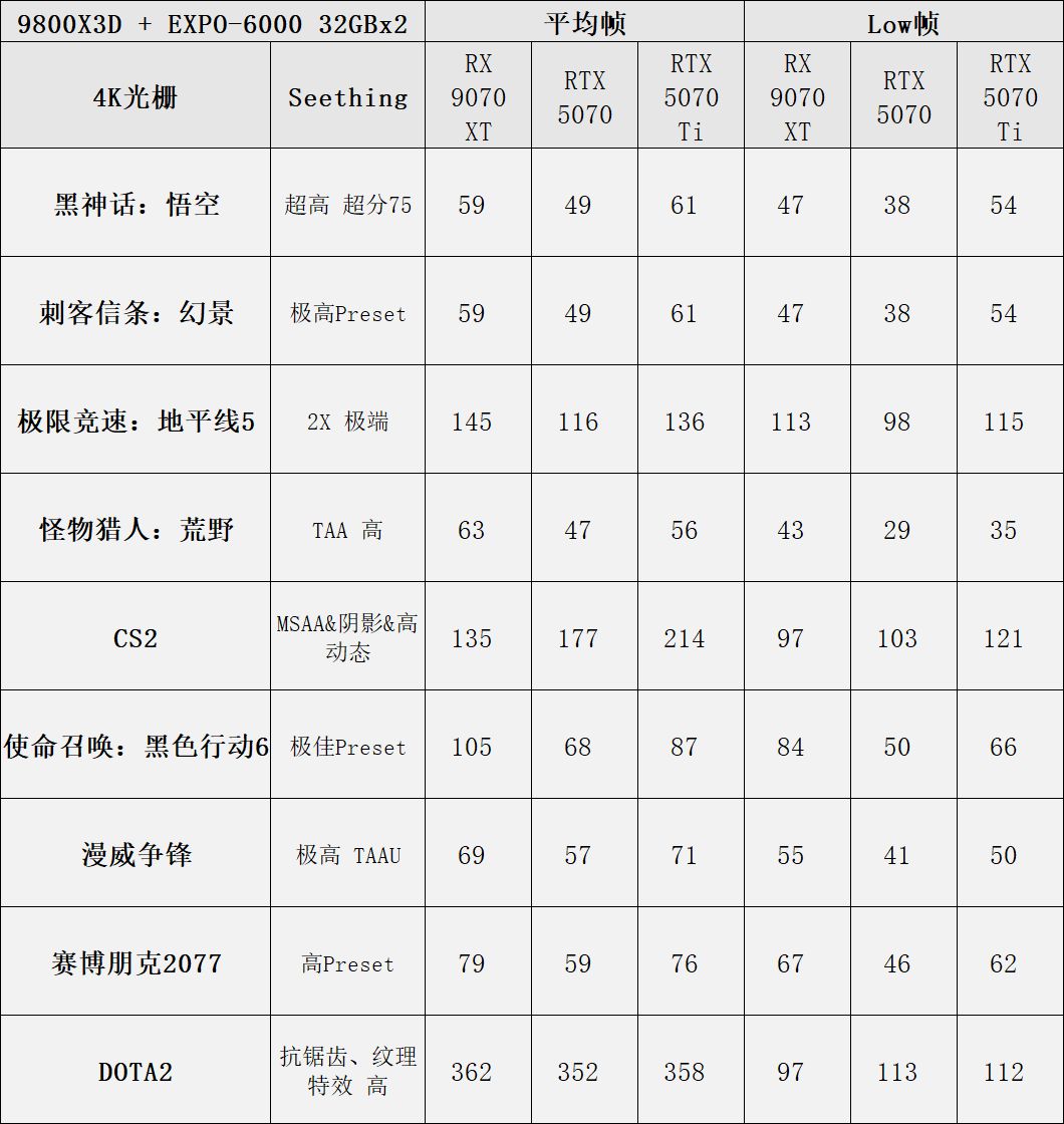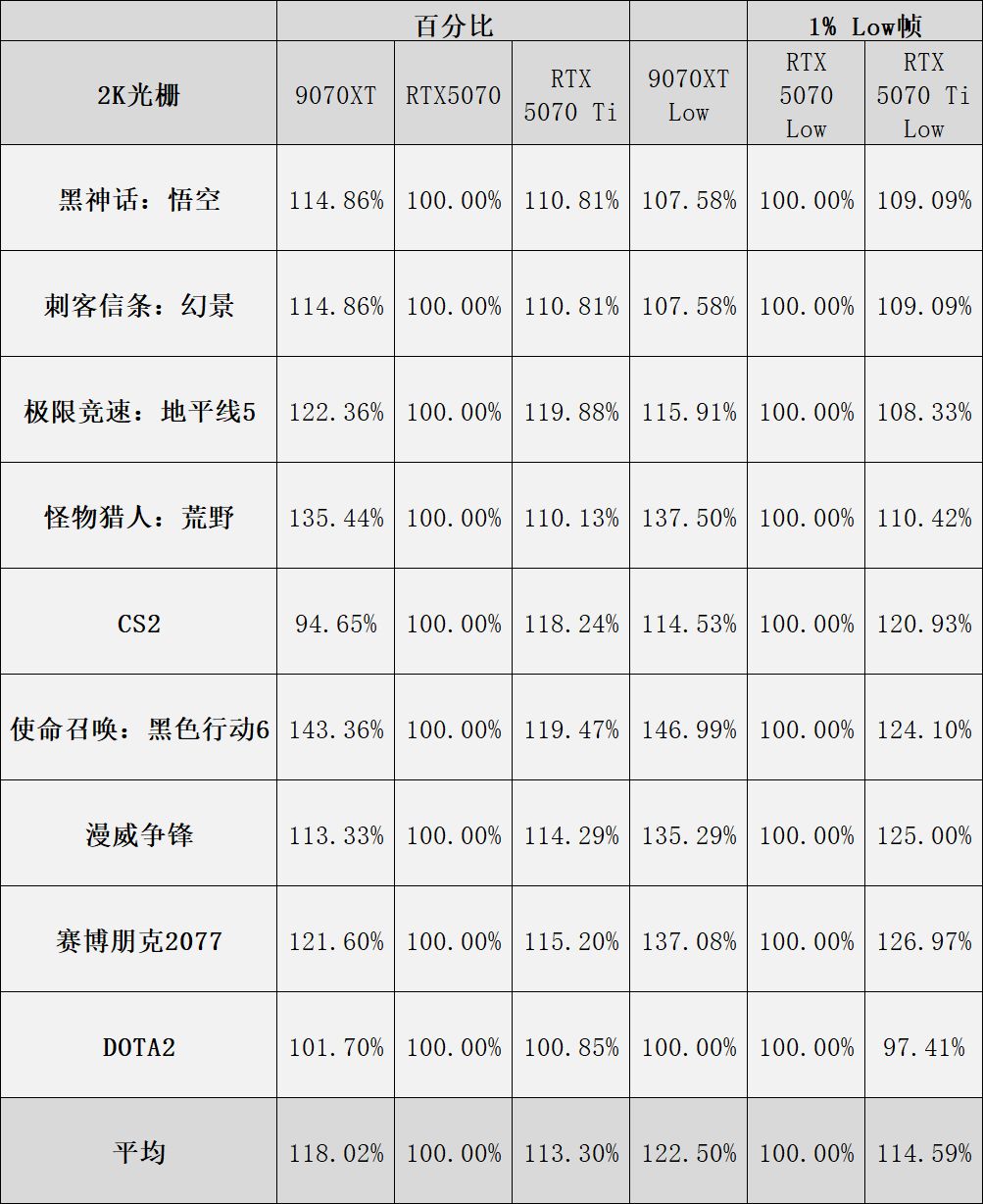 靠着在部分游戏上过分强势的表现,9款游戏的平均领先幅度分别是对5070领先18%,相较5070Ti也有5%左右的领先。Low帧上领先优势更加明显,主要是RND4实打实的有东西,当然,平均取值主要还是需要一个样本量来做支撑,这次测试主要还是选择了主流的游戏。