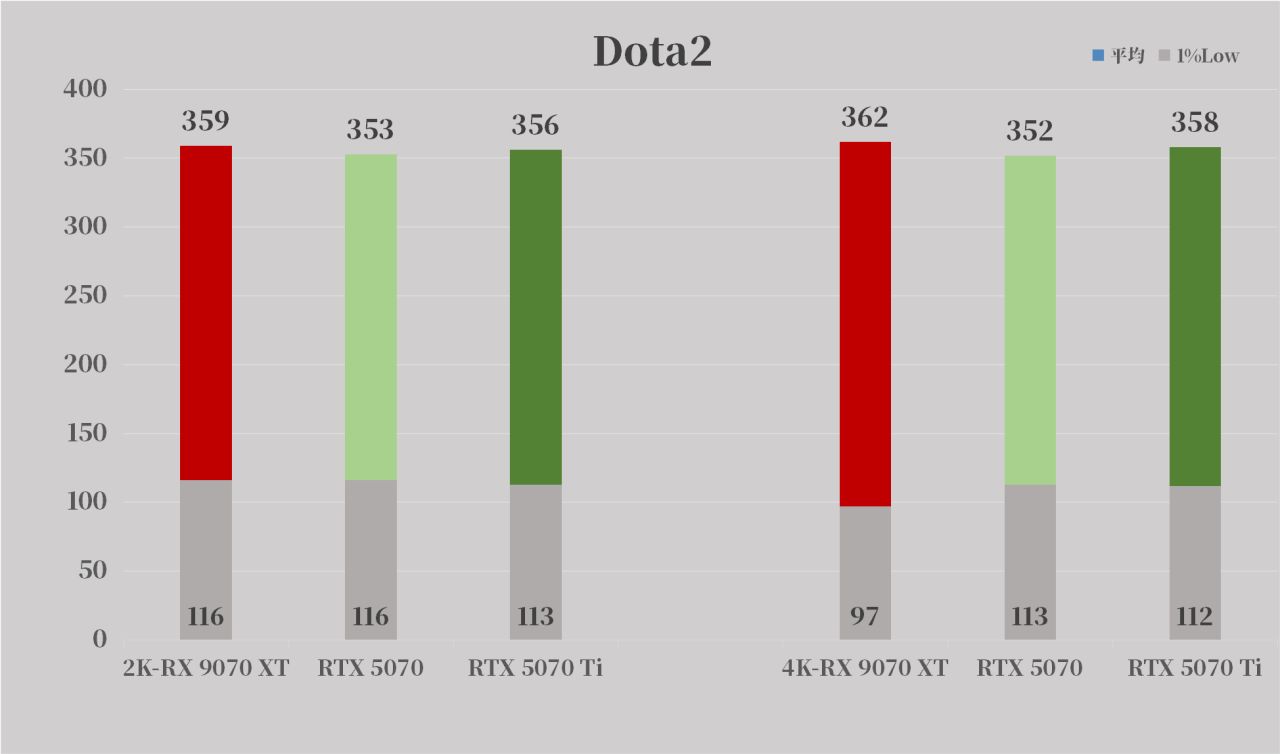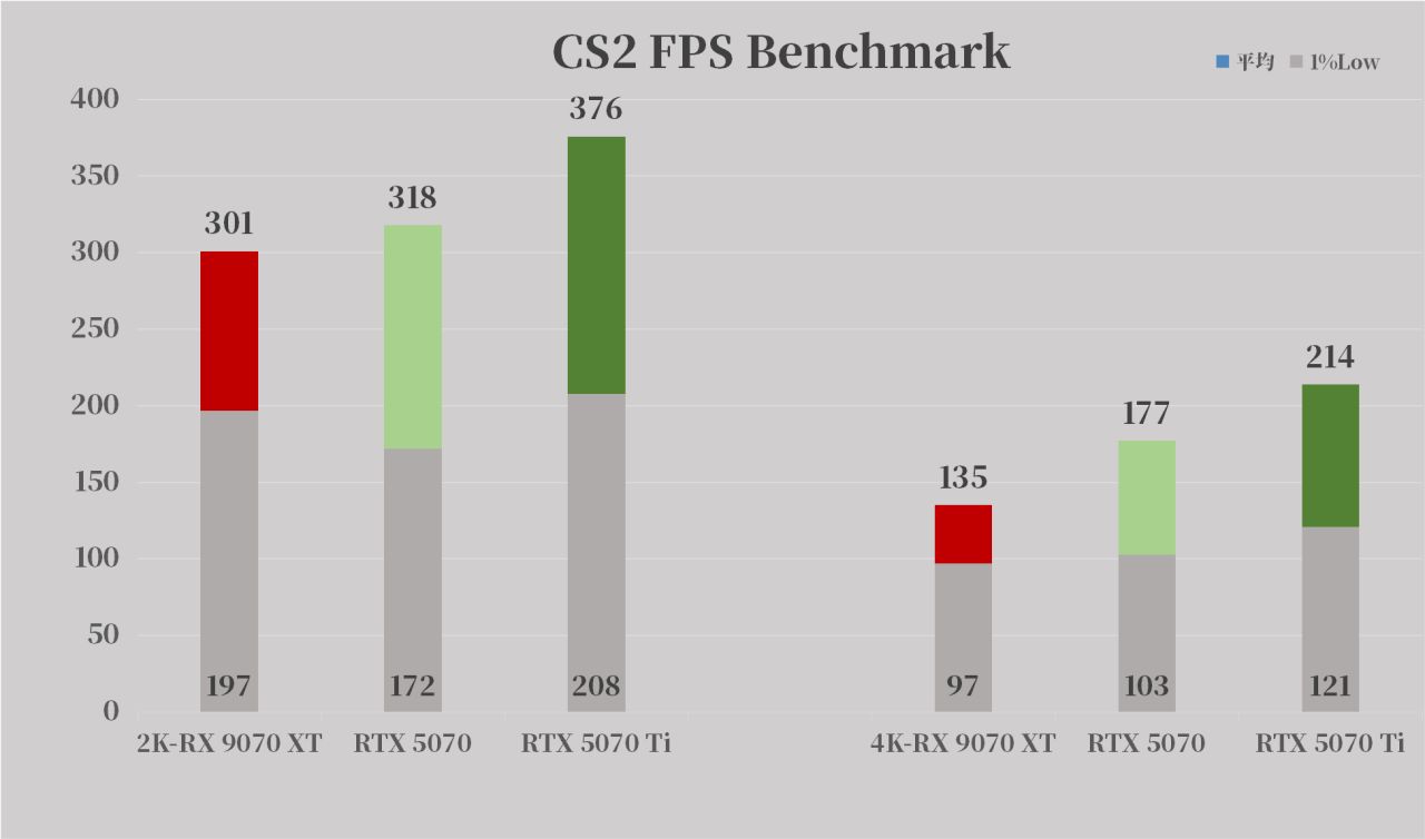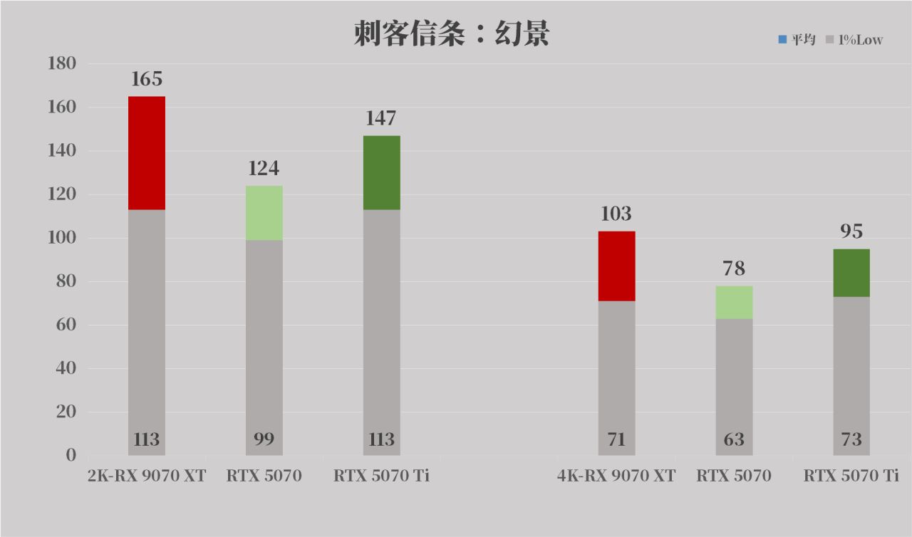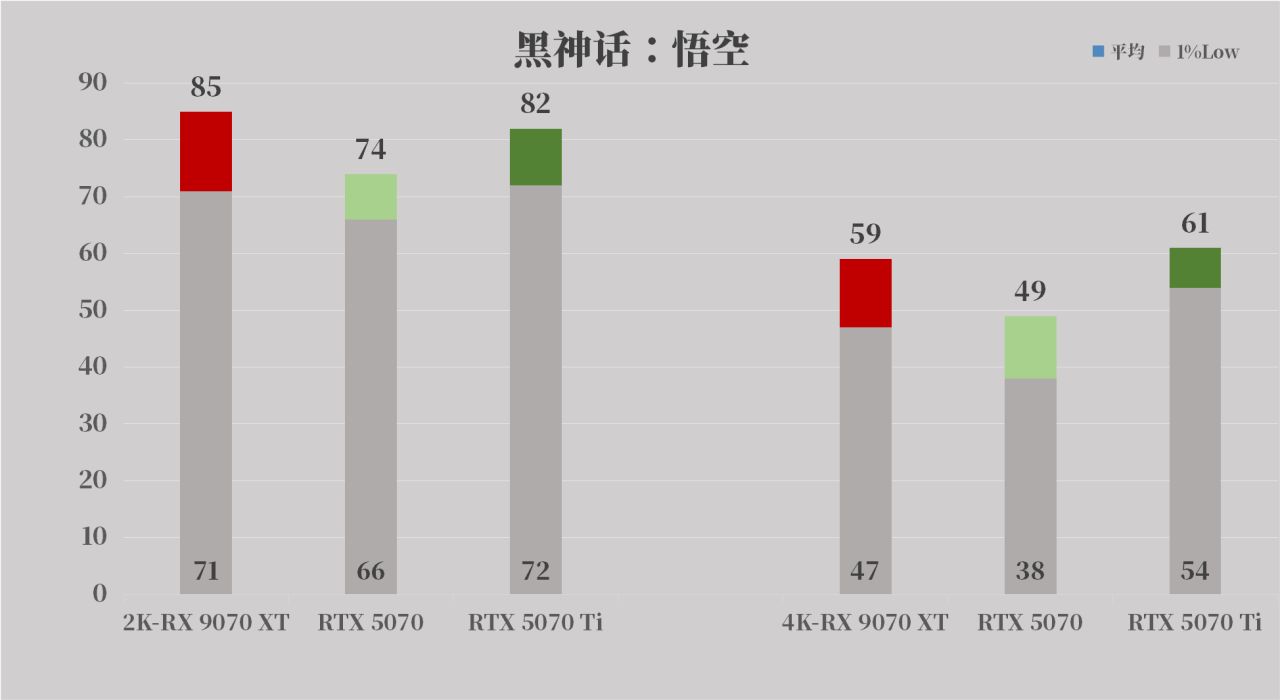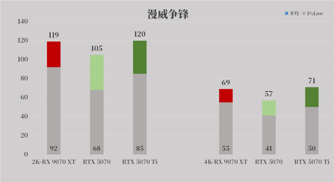 靠着在部分游戏上过分强势的表现,9款游戏的平均领先幅度分别是对5070领先18%,相较5070Ti也有5%左右的领先。Low帧上领先优势更加明显,主要是RND4实打实的有东西,当然,平均取值主要还是需要一个样本量来做支撑,这次测试主要还是选择了主流的游戏。