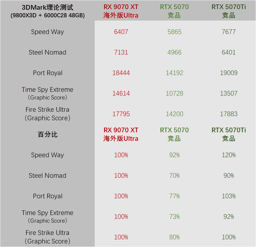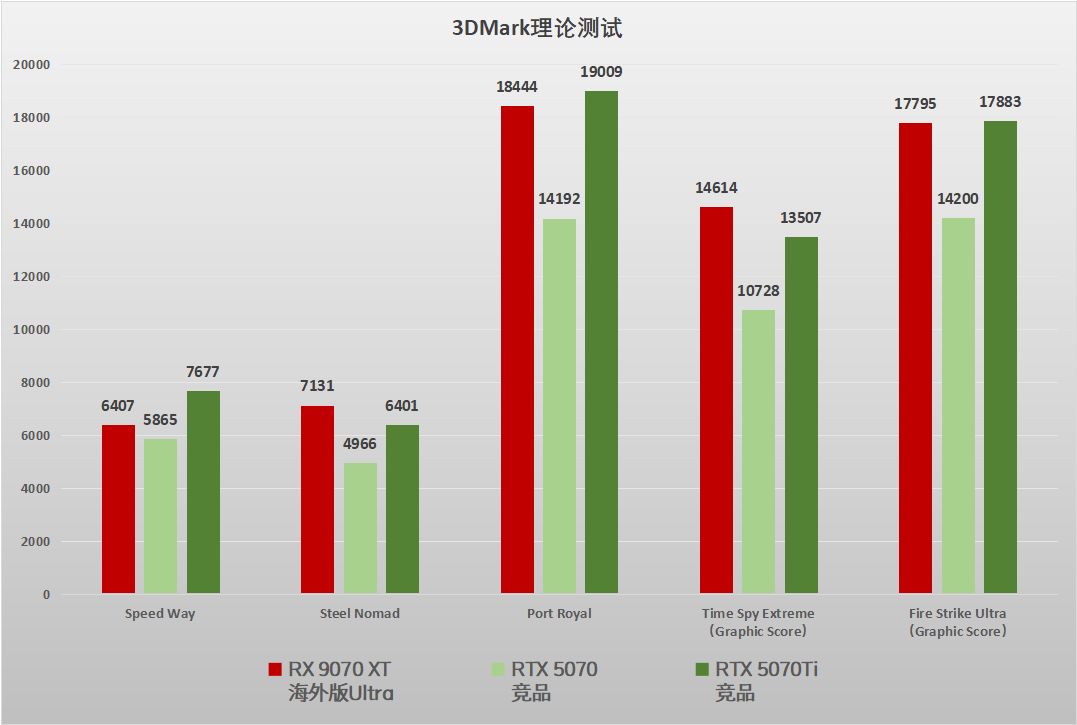 最终的测试结果上来看,RTX5070,就是个弟弟。直接输入查无此人的状态。9070XT在Steel Nomad,TSE的显卡得分上优势明显,PR、FSU上与5070Ti成绩也接近,仅在SW上落后比较明显。