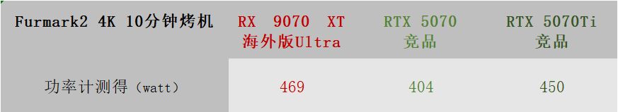 三个显卡在甜甜圈Furmark 2.6 4K 10分钟烤机当中,功率计测得成绩接近,其中9070XT大概469W,5070ti 450W,5070 404W。