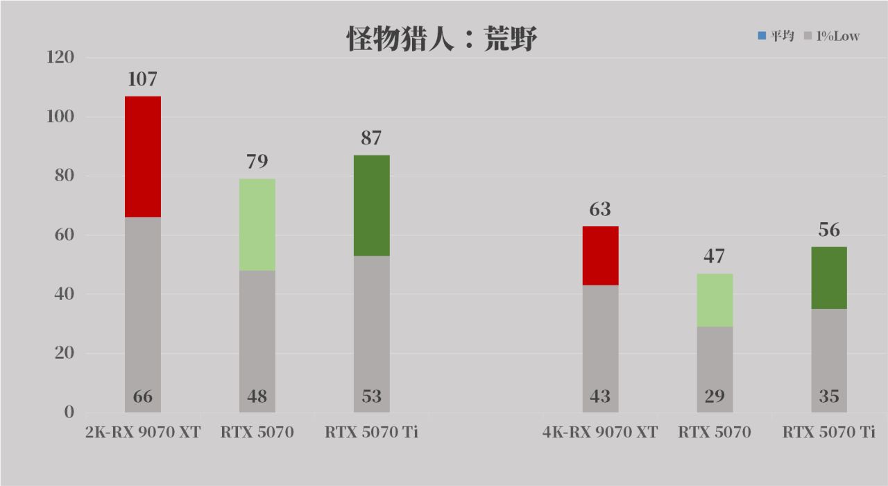 怪物猎人荒野2K分辨率上则大幅领先,4K分辨率高预设下领先范围缩小。
