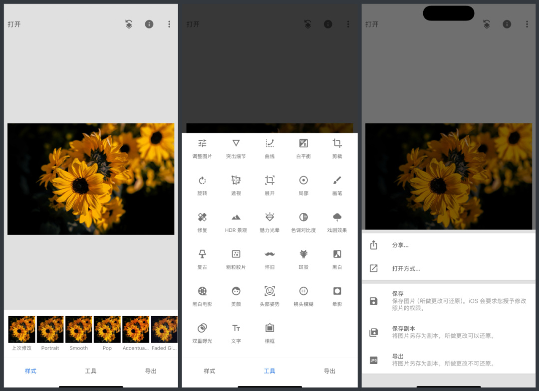 Snapseed 还支持保存个人样式,方便之后一键应用。软件的界面简洁直观,操作方便,很容易上手,最关键的是这么丰富的功能完全免费使用,足以代替其他付费的手机修图工具。