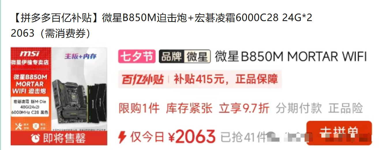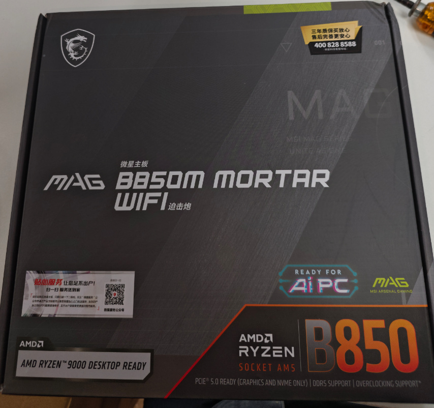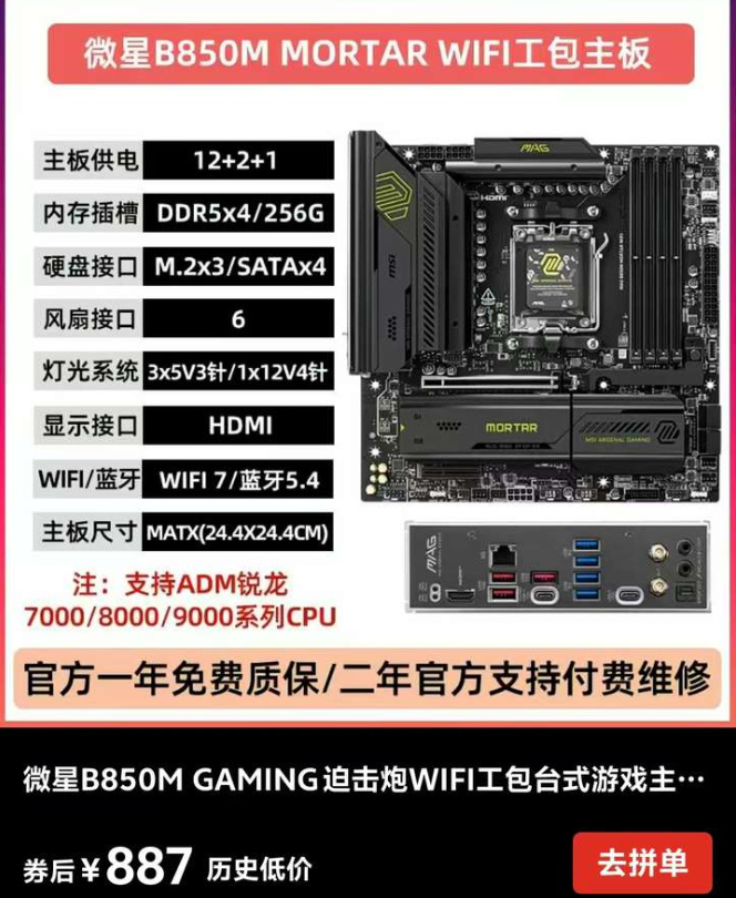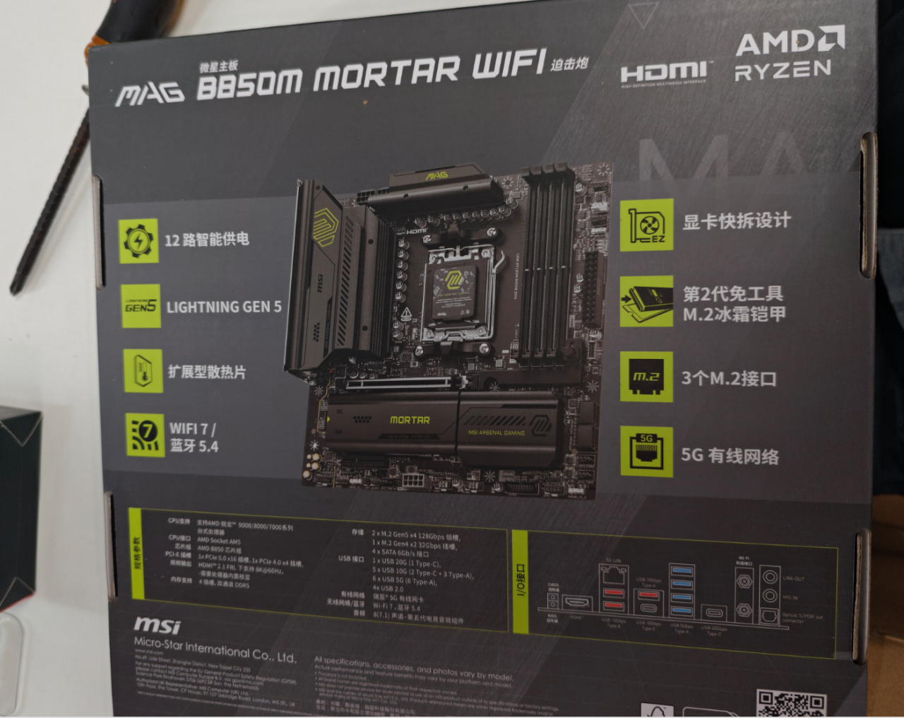 CPU選好了,接下來就是主板,我選擇了B850M最強主板之一 ——微星 MAG B850M MORTAR WIFI 迫擊炮 來帶我的9700X是綽綽有餘了,後面換個R9也是輕輕鬆鬆,