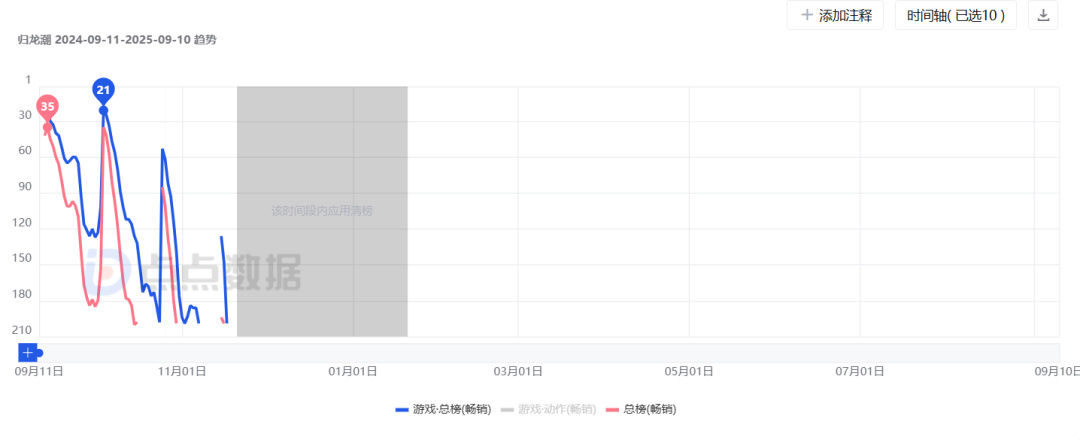 在这种种情况之下,《归龙潮》虽上线后取得过还不错的成绩,在24年9月21日上线后,《归龙潮》iOS游戏畅销榜的成绩最高来到了21名。但后续就在波动中逐渐下滑。