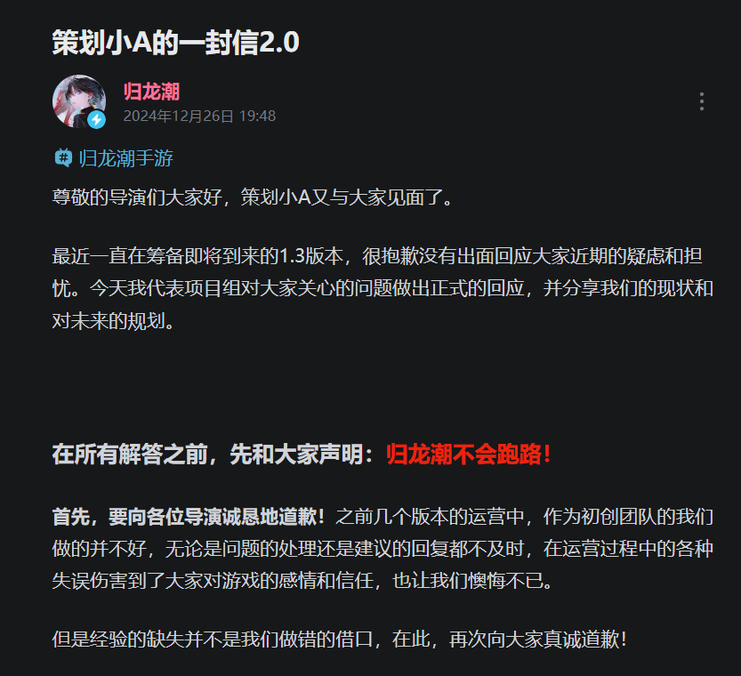 这时再回过头去看小A的承诺,也是令人感到十分唏嘘,《归龙潮》团队确实是挣扎求生过了,但在收入不及预期的情况下,也很难支撑着团队进一步往下走。
