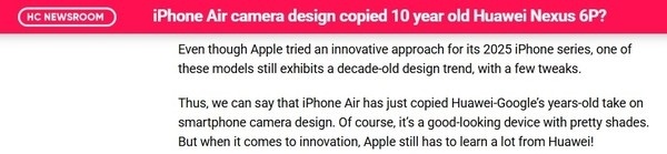 苹果最新推出超薄设计的iPhone Air机型,但其摄像头设计引发热议,被质疑抄袭十年前华为与谷歌合作设计的Nexus 6P手机。
