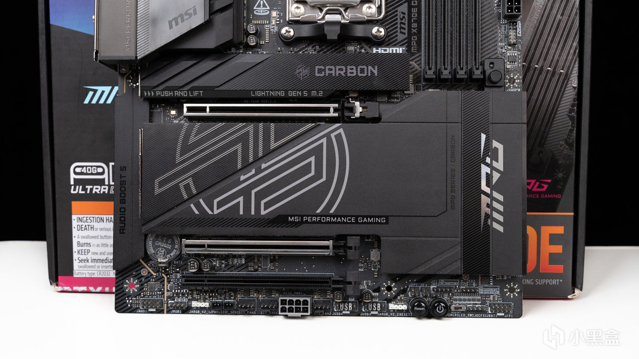主板外观延续了暗黑家族独特的碳纤维风格,X870E暗黑格外亮眼的是I/O装甲上的黑镜龙纹,通电之后整体只有龙纹和CARBON LOGO有ARGB灯效,有一种低调奢华的感觉。