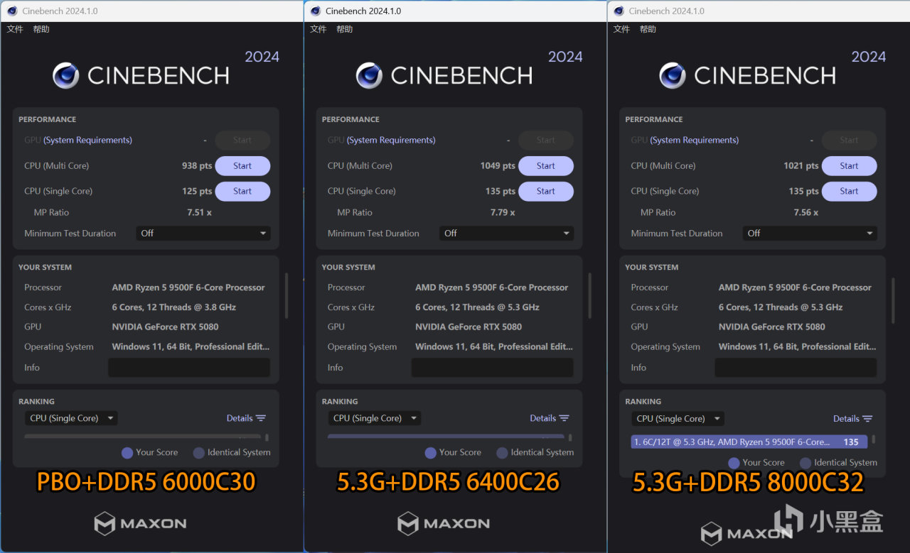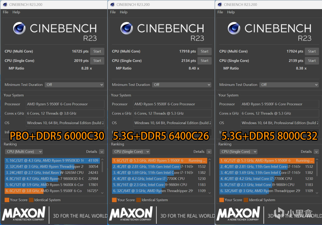 来到重头戏的跑分项目CINBENCH R23,常规PBO+EXPO单核和多核性能,基本等同于未开启PBO的9600X。6400C26和8000C32没什么差别,都是基于全核超频带来的提升,多核能提升7%,单核则是6%幅度。