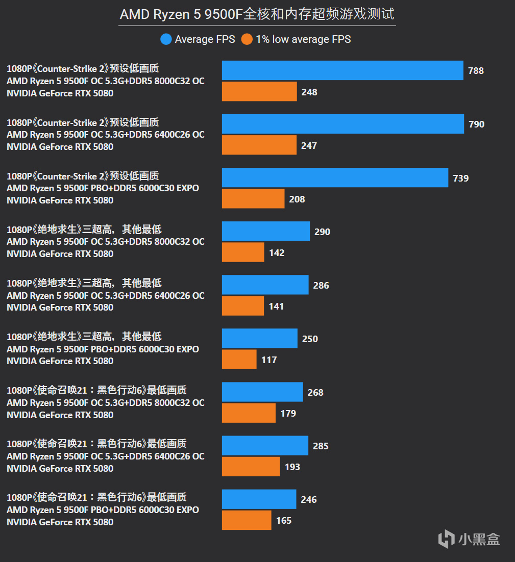 《绝对求生》作为经典网游对比项目,6400C26和8000C32自然提升也明显,1% LOW帧都是21%幅度,而前者平均帧提升14%,后者则是16%更强,看来吃鸡还是高频内存吃香一丢丢,只是没有英特尔那么明显罢了。