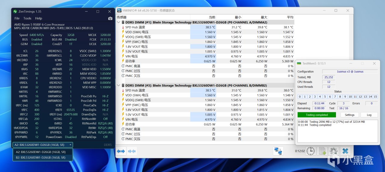 1:1同频状态下,这颗9500F内存频率是顺利达成DDR5 6400C26-36-36-58,副时序和第三时序也可缩紧参数,内存电压需要设定1.56V,当然过测TestMem5烤机就需要加风扇,至于FCLK频率并不是越高越好,同频6400最佳是对应1:3比例所以是2133MHz,6200则是2067MHz。