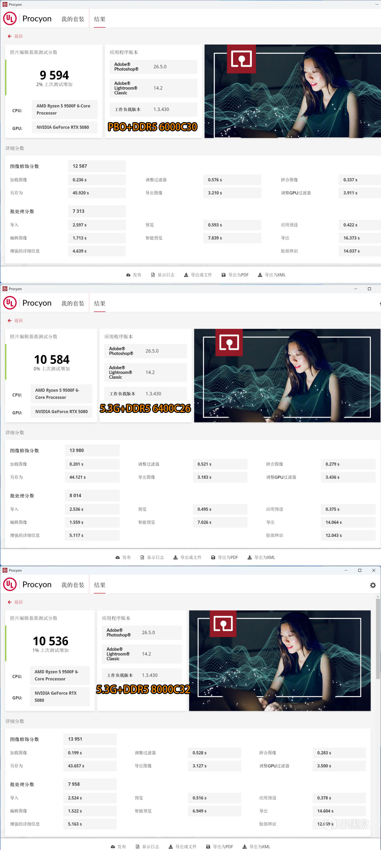 Procyon照片编辑基准测试,主要涉及PS和LR两个项目,对于CPU和内存性能都较为敏感,因此能看到6400C26和8000C32结合CPU超频,均相比PBO+EXPO提升10%,对于生产力项目来说,收益是相当可观了。