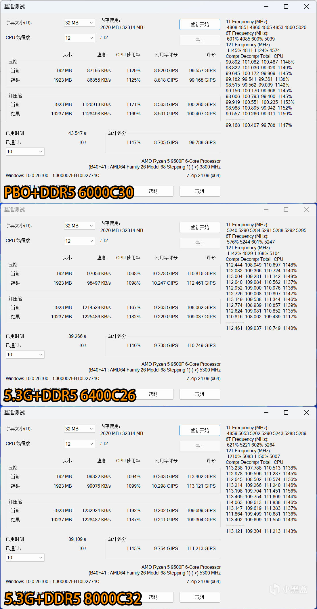 不过超频收益就挺大的,尤其压缩内存性能影响很大,6400C26和8000C32均能提升14%,而解压缩主要是关联核心规模和性能,全核5.3GHz能提升9%。