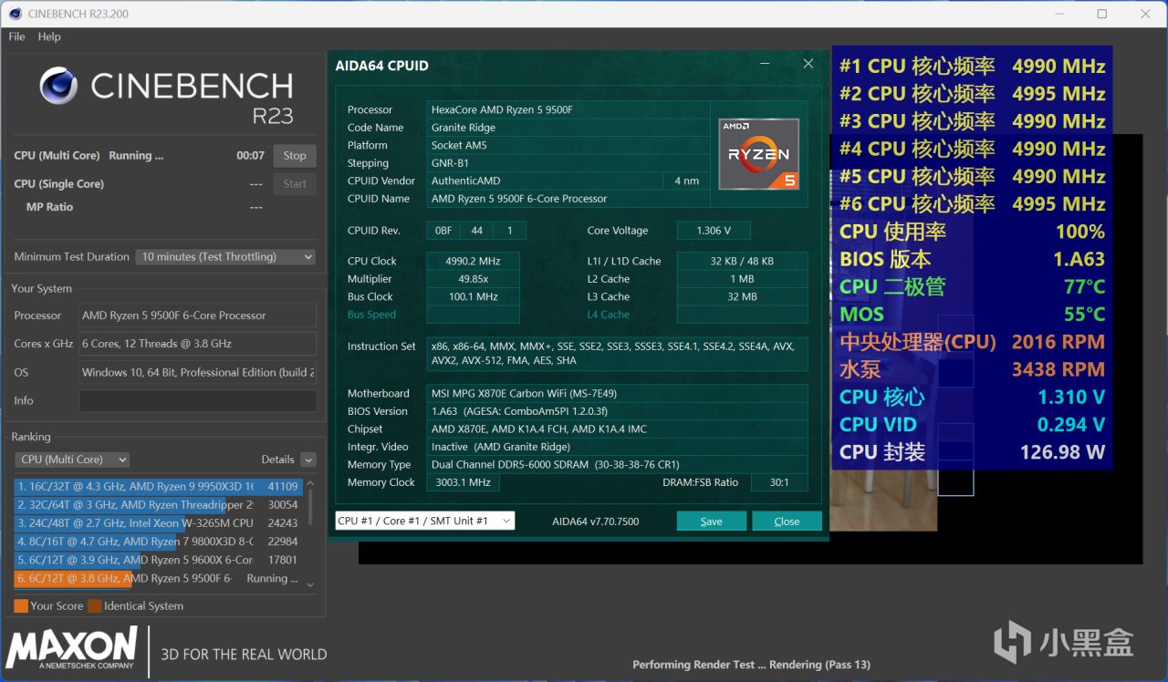 首先来看9500F的功耗和温度表现,开启PBO之后运行CINBENCH R23十分钟多核循环,频率能稳定5.0GHz左右,1.31V电压下功耗是126W左右,比9600X自然低一点,比14600KF就低太多了,CPU二极管最高温度77℃也不高。对于不折腾的纯粹游戏玩家,建议不需要开启PBO,温度表现还能更漂亮。