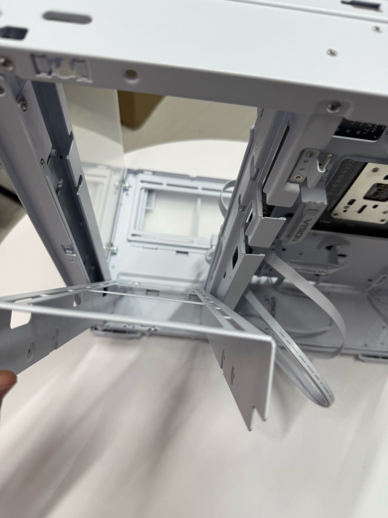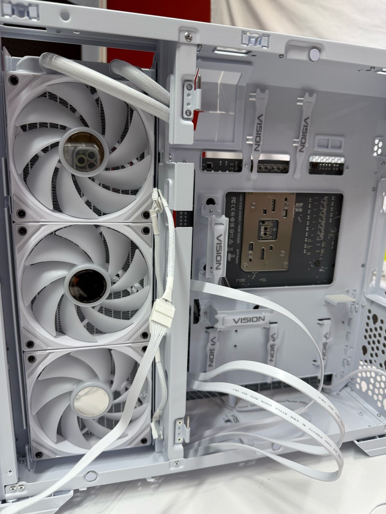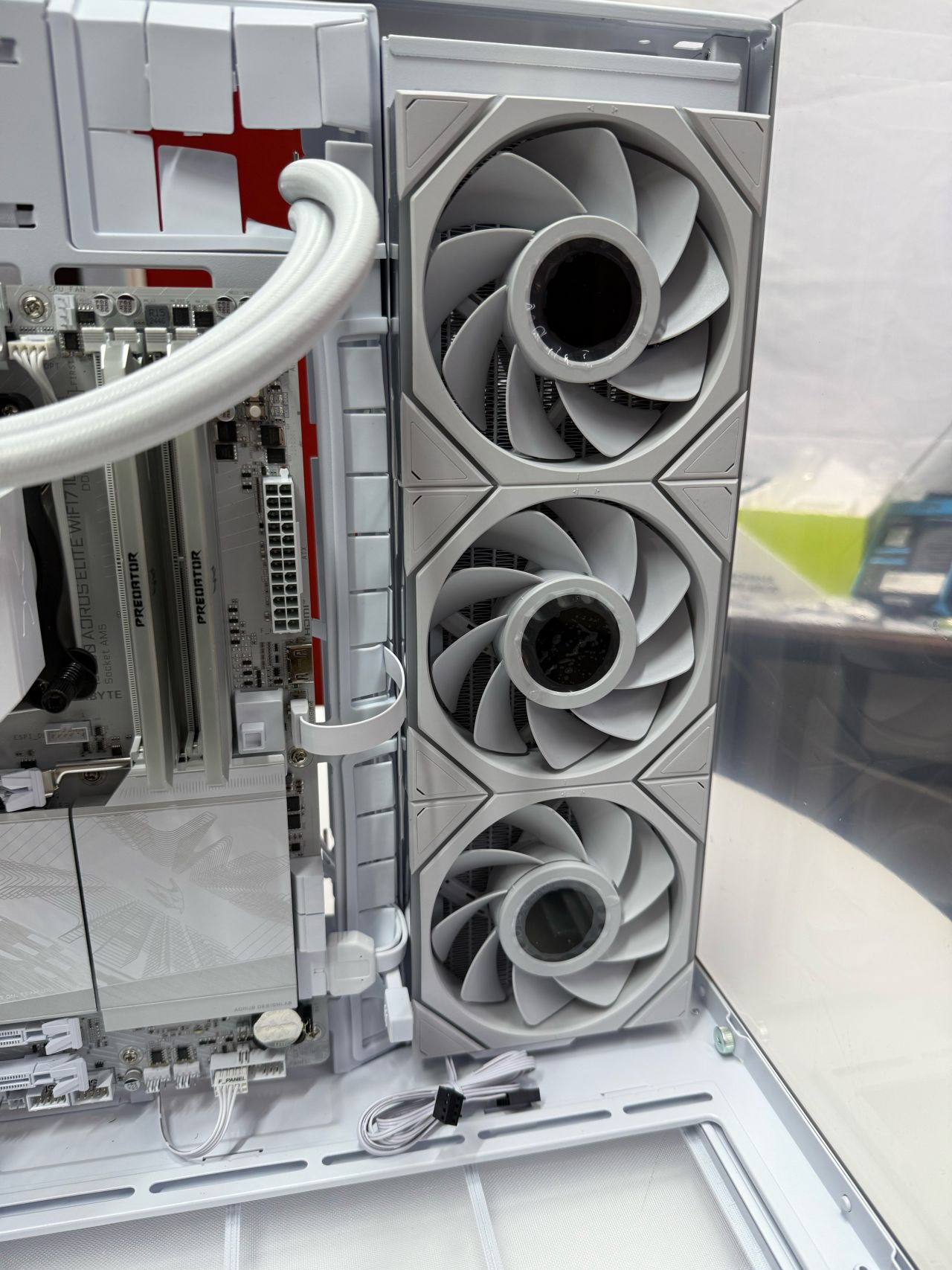 将水冷排装在后侧,然后通过机箱上的洞将冷头穿到机箱前面,冷排这里和正面的联力风扇做一个夹汉堡的固定方式