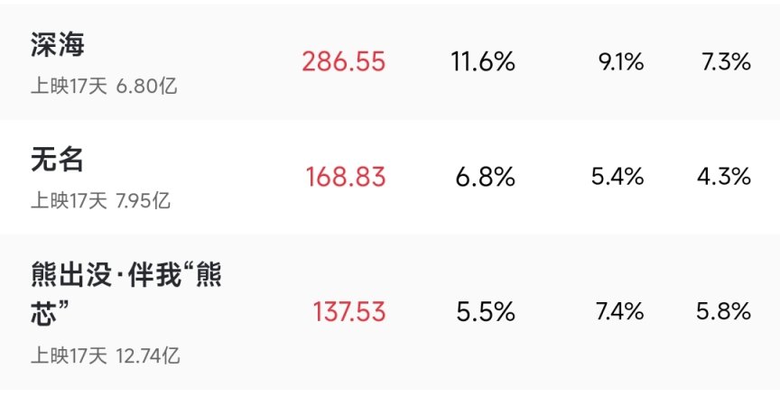上映17天,票房破12億元。也是熊出沒系列首次進入10億,另一方面電影上映前大家預測票房爆倉的《深海》也是早就被斬於馬下。畢竟好的畫面大家都有,講好故事的本事就不一定了。