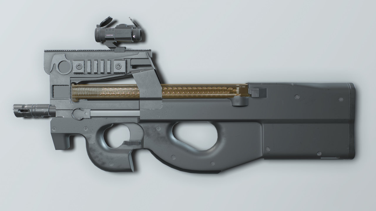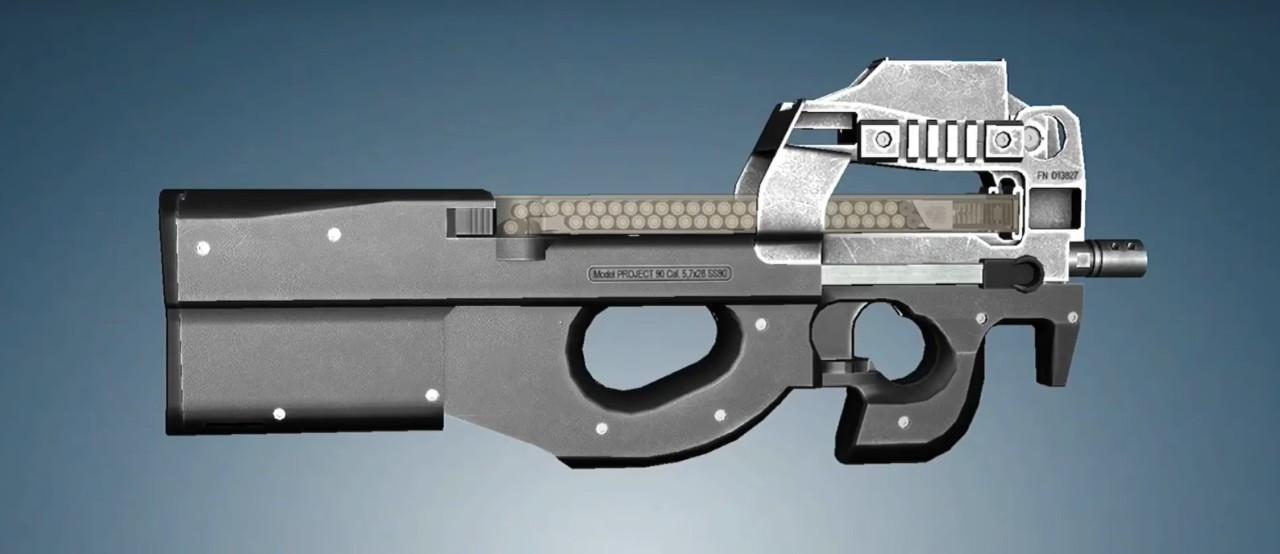 P90衝鋒槍的彈匣是位於槍管上方,彈匣直長條形而與槍管平行。