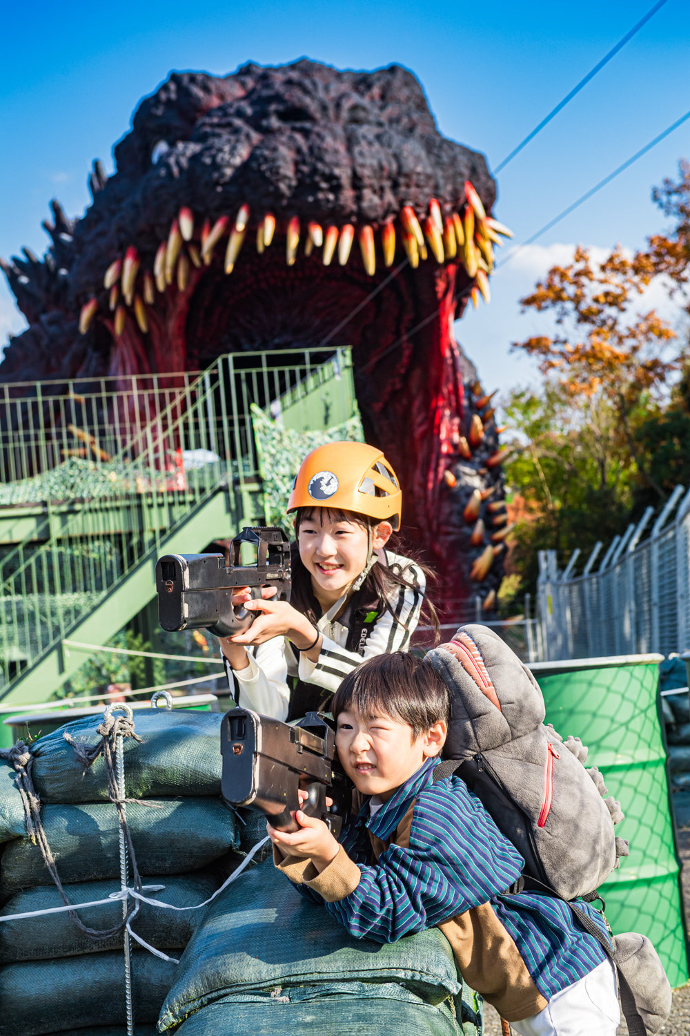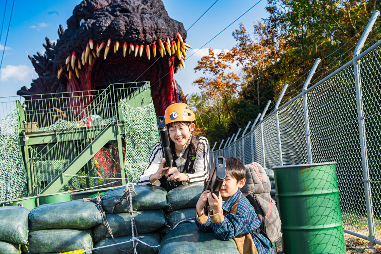 (淡路島「Nijigen no Mori」動漫主題公園,以巨型哥斯拉爲背景拍攝完美照片)