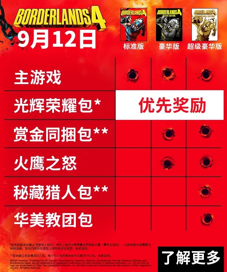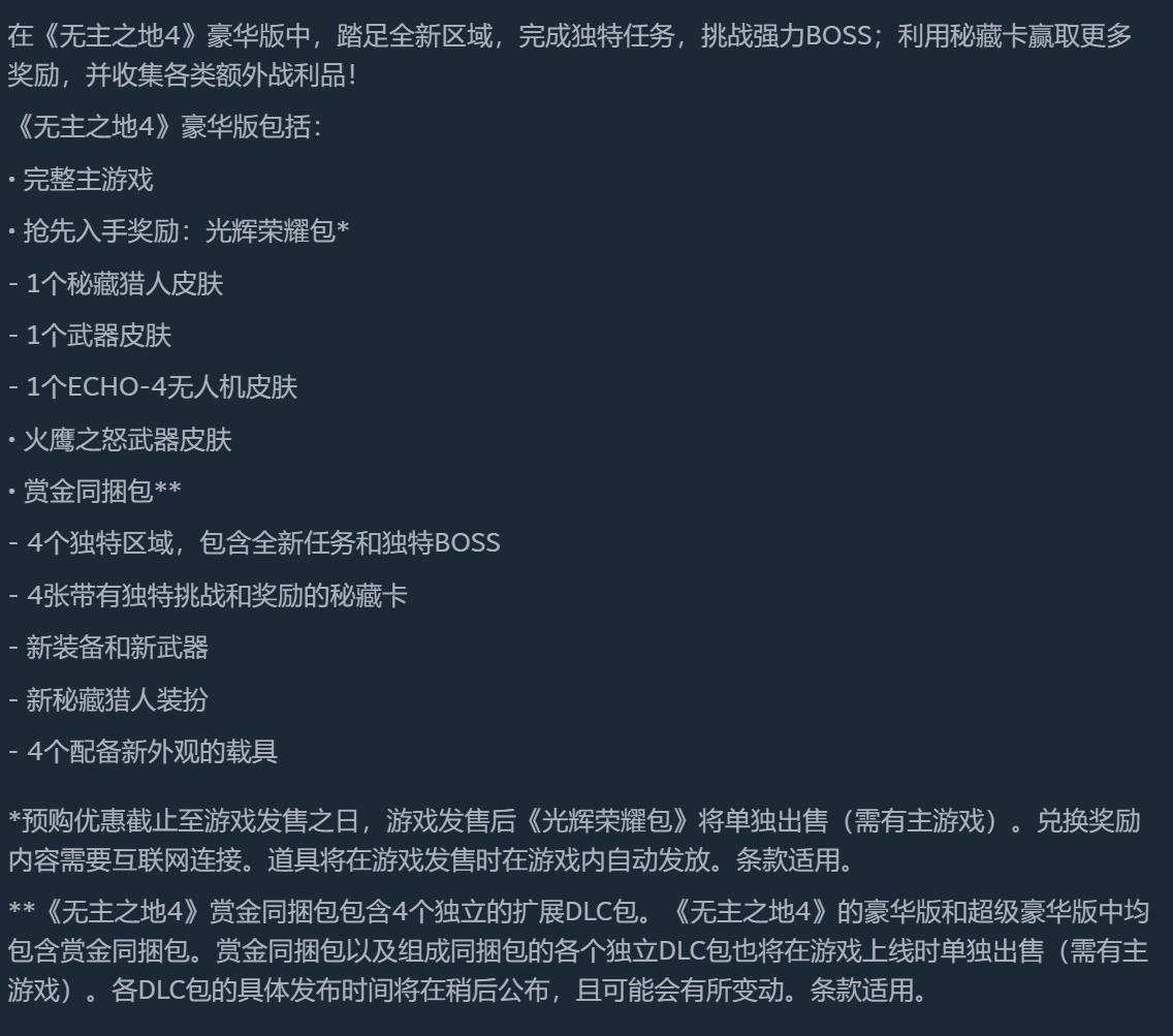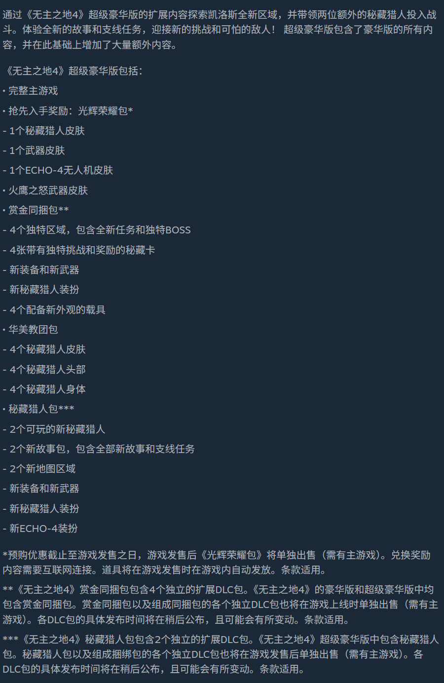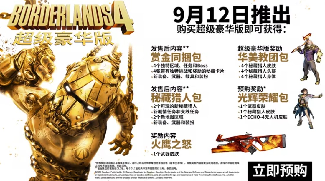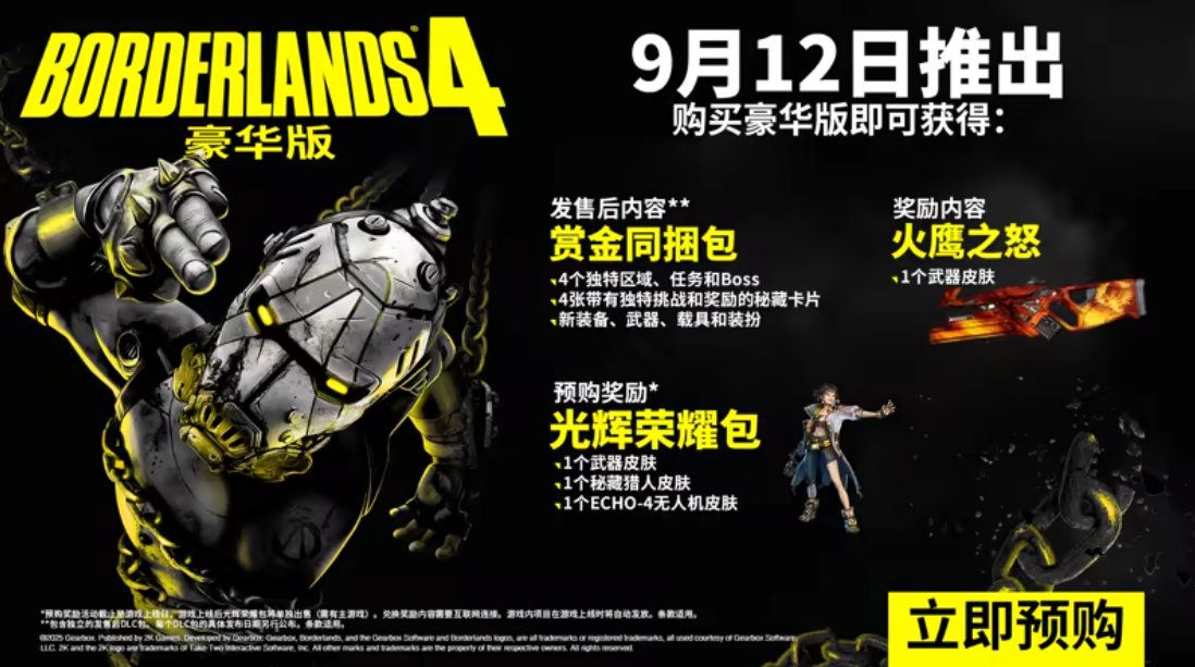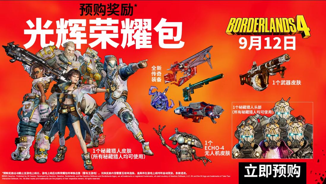預購《無主之地4》即可獲贈光輝榮耀包,內含四件助你直衝等級上限的傳奇裝備、所有祕藏獵人均可使用的1款祕藏獵人頭部和1款祕藏獵人皮膚、1款武器皮膚以及1款ECHO-4無人機皮膚!*