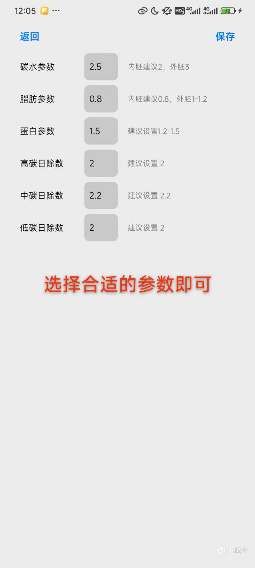 低碳日×2:總碳水×15%÷2;總脂肪×50%÷2天