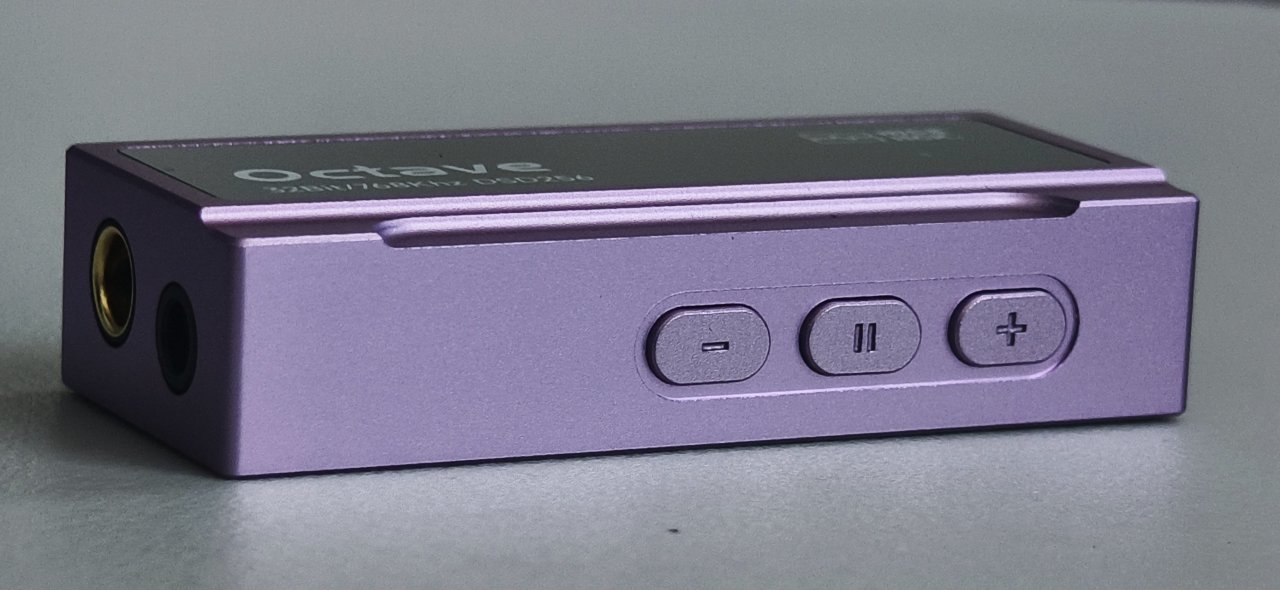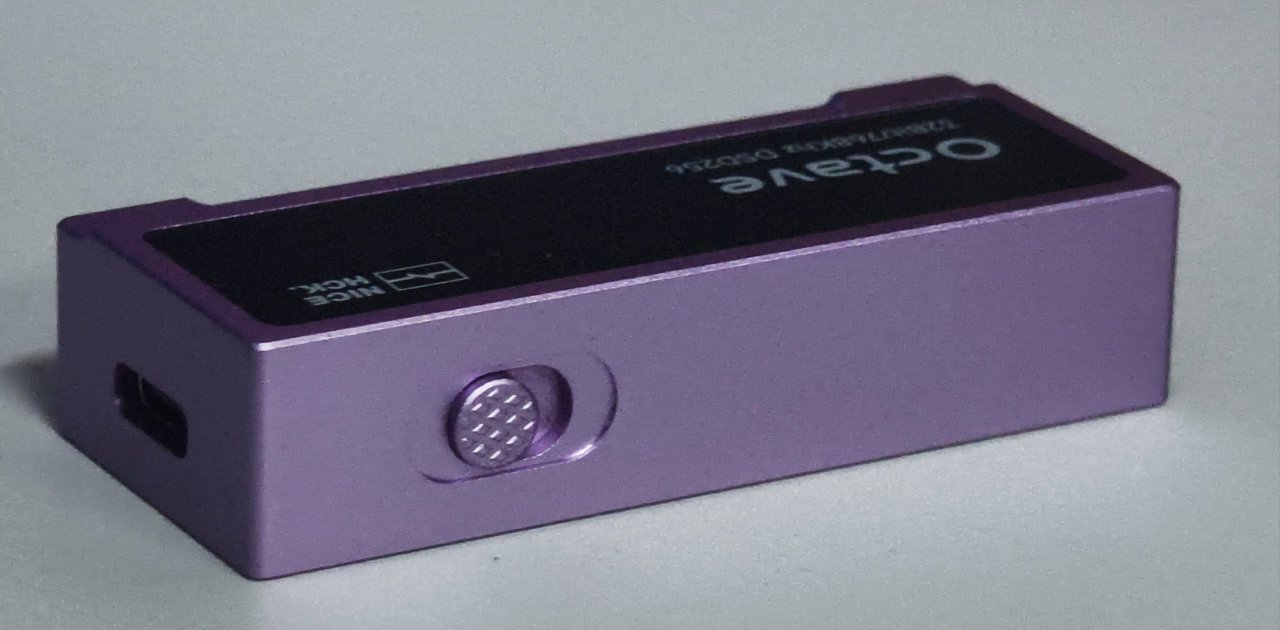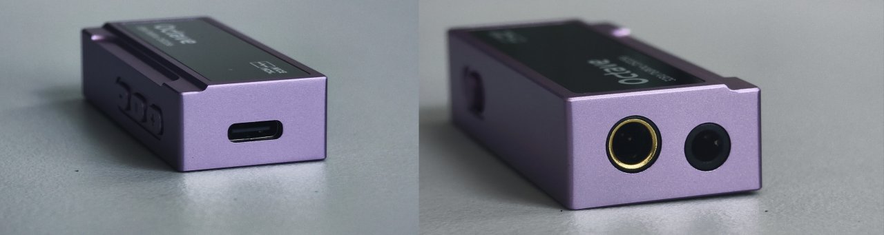 機身的正反面是一塊黑色的有機玻璃,上面還印刻者品牌的名稱以及這塊耳放的型號與參數。這塊黑色玻璃搭配紫色外殼還是蠻好看的,給人一種奢華典雅的感覺,當然雖然整體增加了美觀度,但相對着這塊玻璃也比較容易沾染指紋