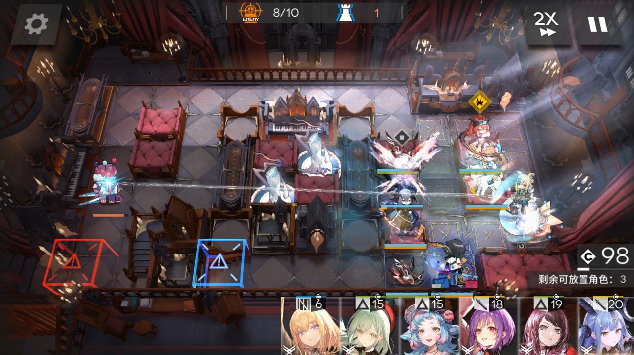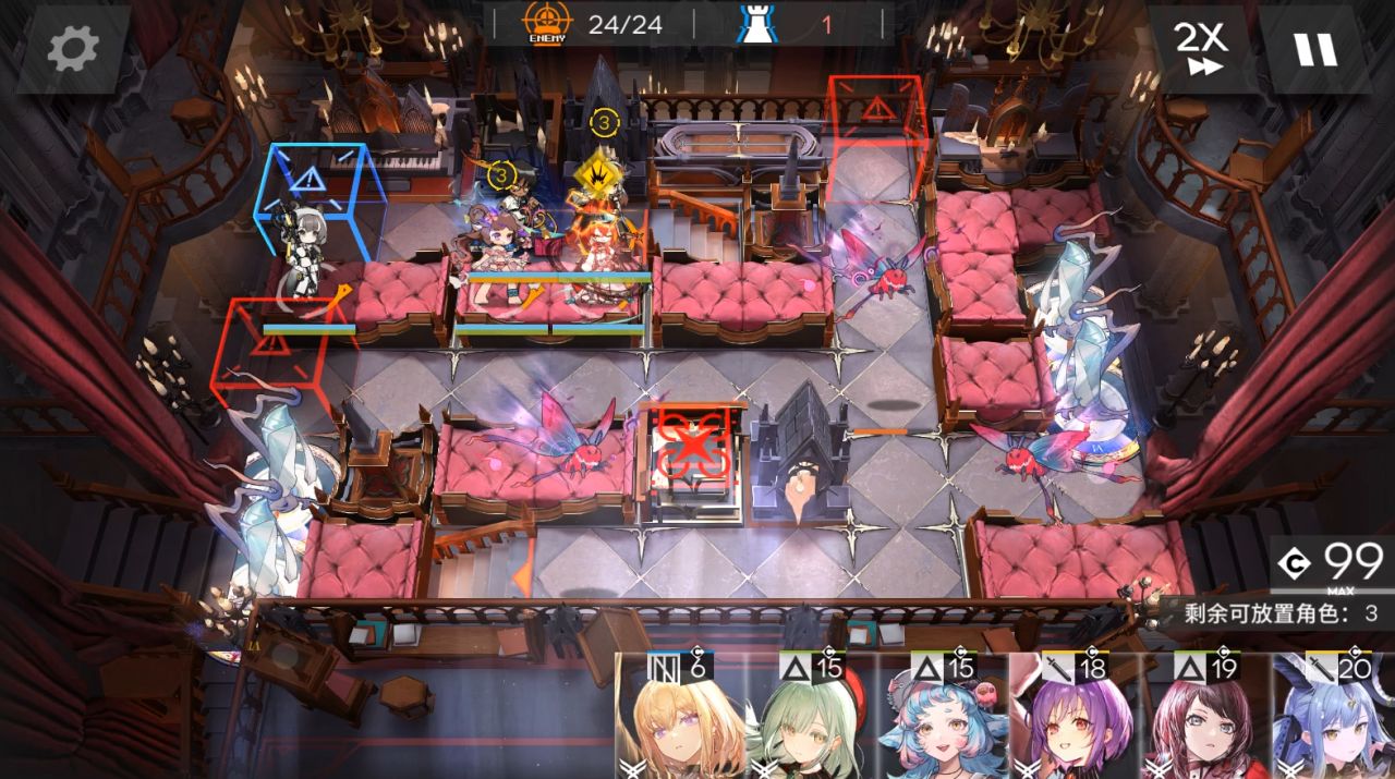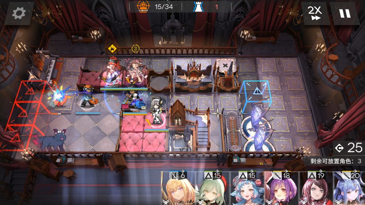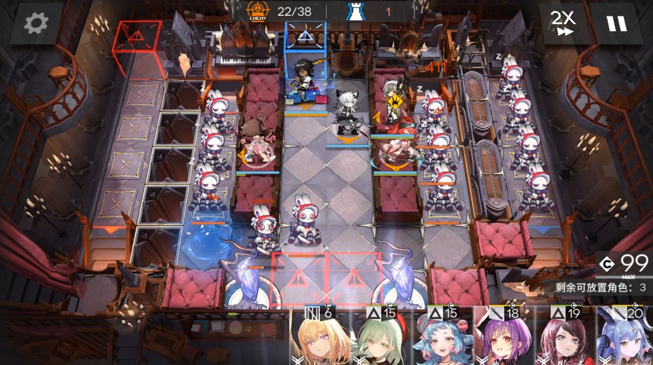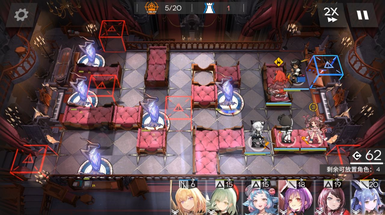 依次部署棘刺朝左,蜜莓朝上,拉普朝右,小羊朝左,大姨朝上挂机。