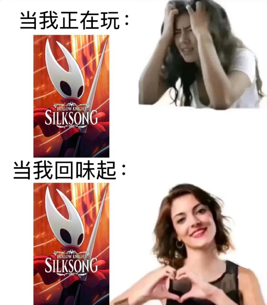 我现在算是明白为什么Team Cherry能做一个游戏做了7年,越做越上头了。本来制作组人数也不多,一个人突发奇想“唉!我有一个折磨玩家的好点子!”然后几个人叽里呱啦一顿商量,一拍即合。然后接下来等游戏发售就坐在电脑前一边看玩家受苦骂娘,一边苍蝇搓手发出“桀桀桀”的奸笑。。。。。。这么一带入,如果我是制作组我也挺想犯贱呢?(狗头保命)
