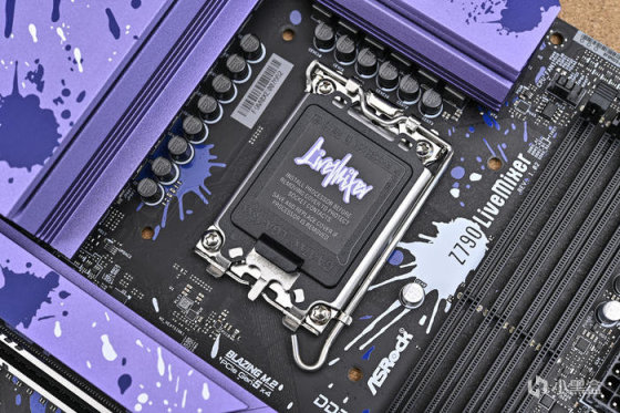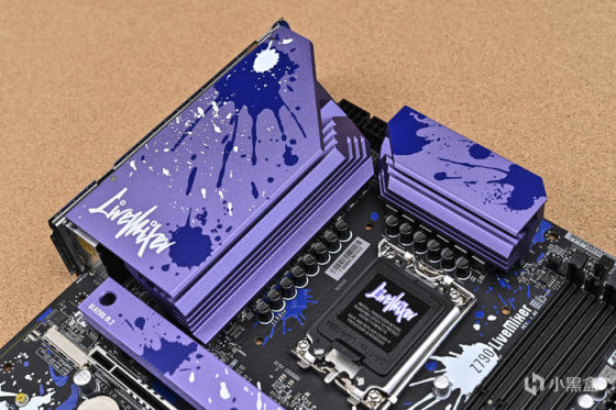 華擎 Z790 LiveMixer 主板供電散熱紫色裝甲上的塗鴉噴塗以及 LiveMixer 藝術字體標識。