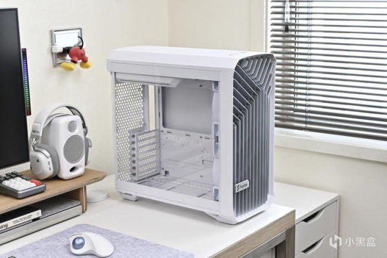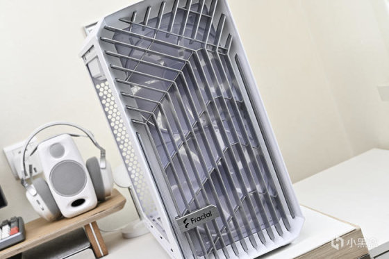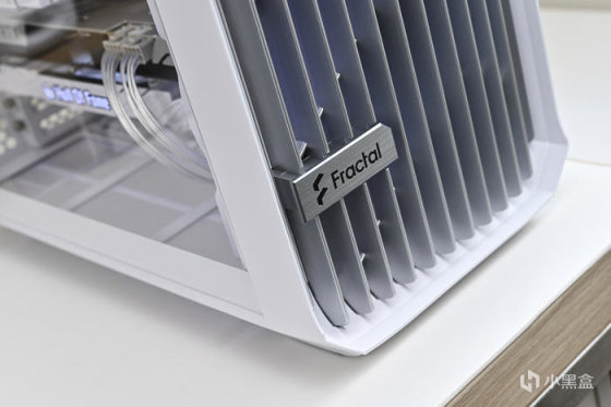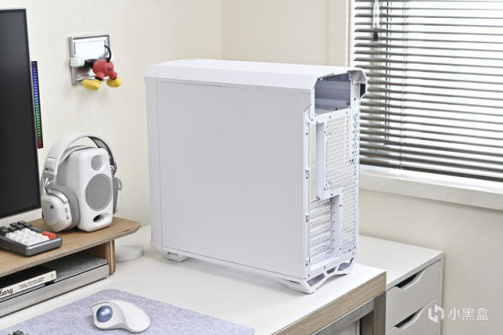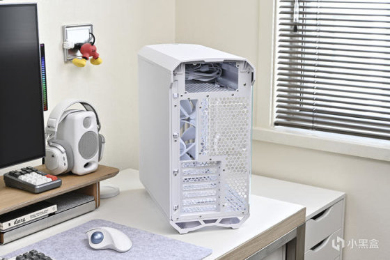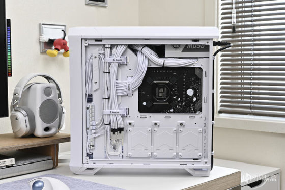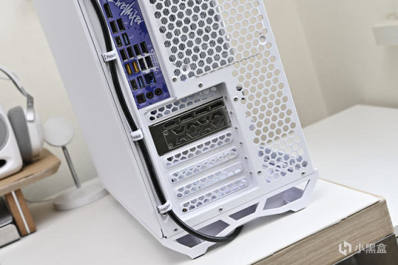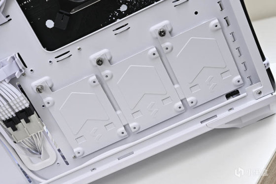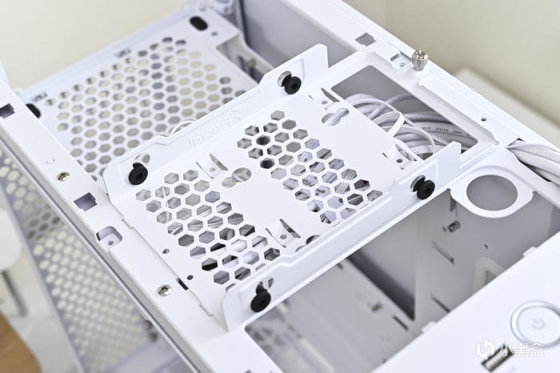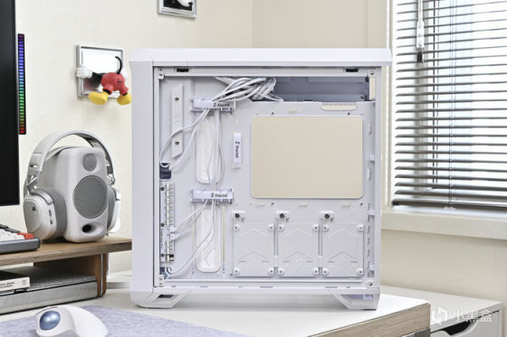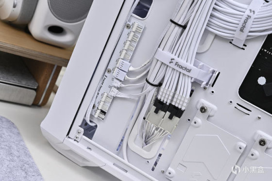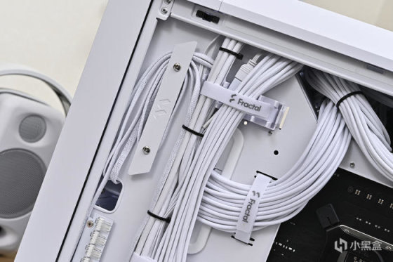 機箱背部豐富的理線粘及卡扣位方便理線,之前一直對分型工藝機箱的理線設計印象深刻,尤其是前面板 I/O 線材,基本上長度都預留的很合適,這次更是配合機箱配色做了全部白化處理好評,此外新加入的左上角繞線器和左下角風扇集線器讓各類理線更加輕鬆。2.5 英寸的硬盤支架全都藏在背面,背面共有 3 個 2.5 英寸硬盤支架。
